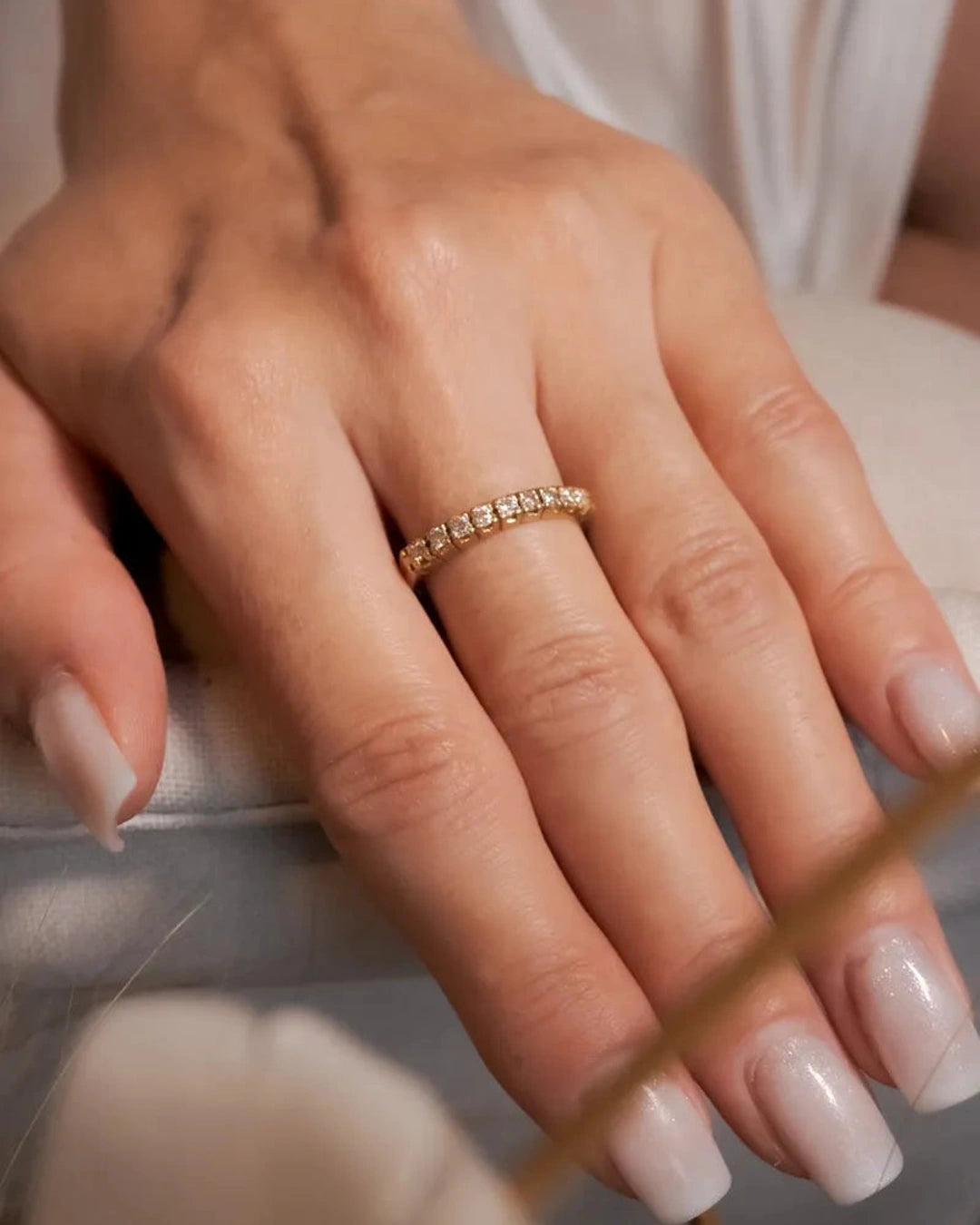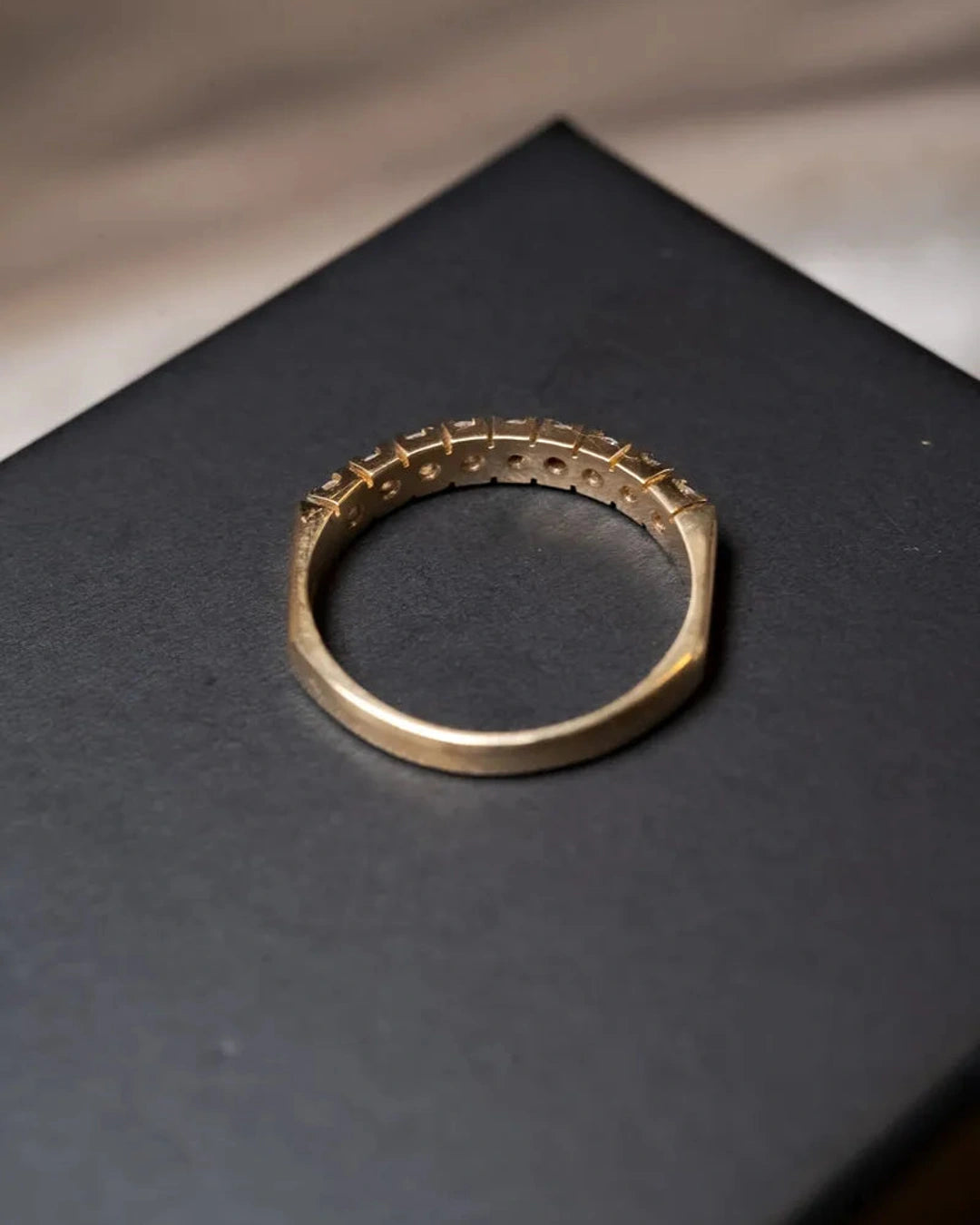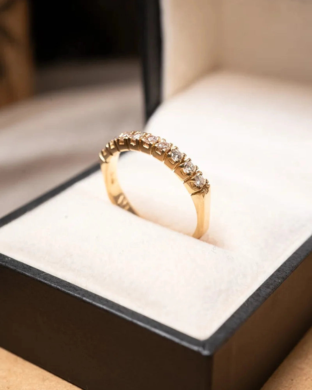 Meia aliança em ouro amarelo 18k com nove diamantes de 05 pontos cada, qualidade VVS1. Peça delicada e sofisticada, pesando 3,6g e disponível no aro 20. Ideal para quem busca elegância discreta com o brilho inconfundível dos diamantes naturais de alta pureza.