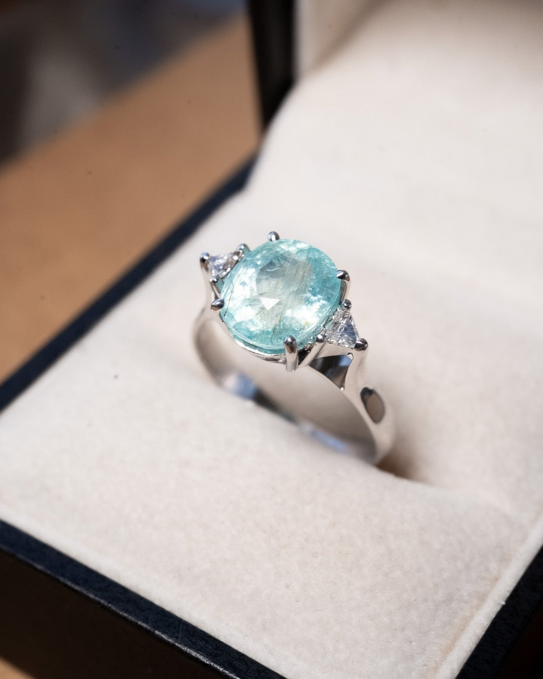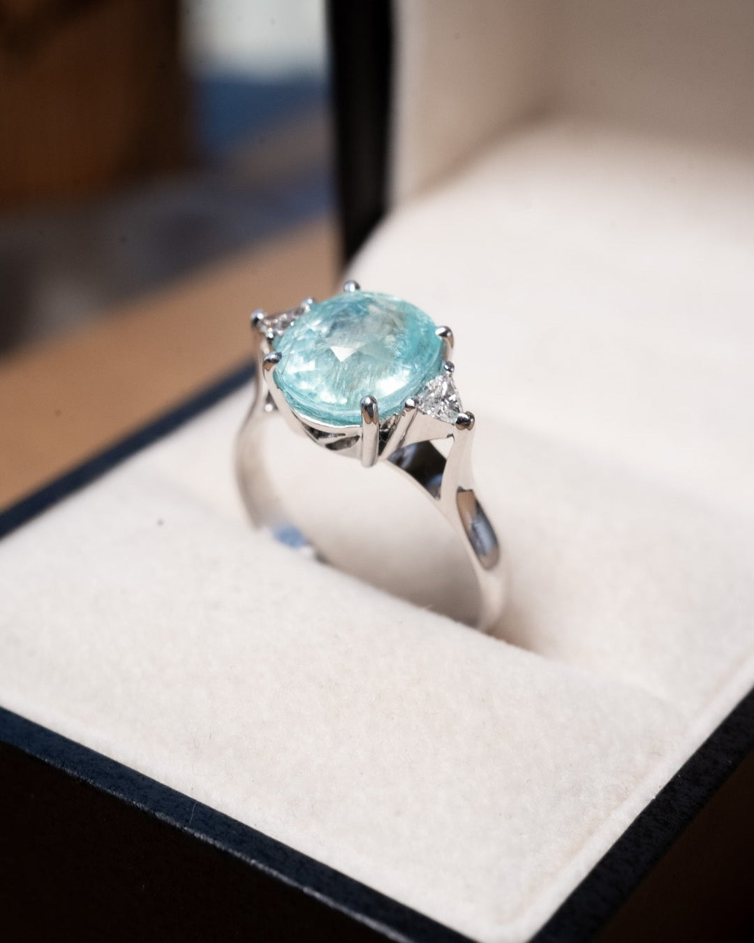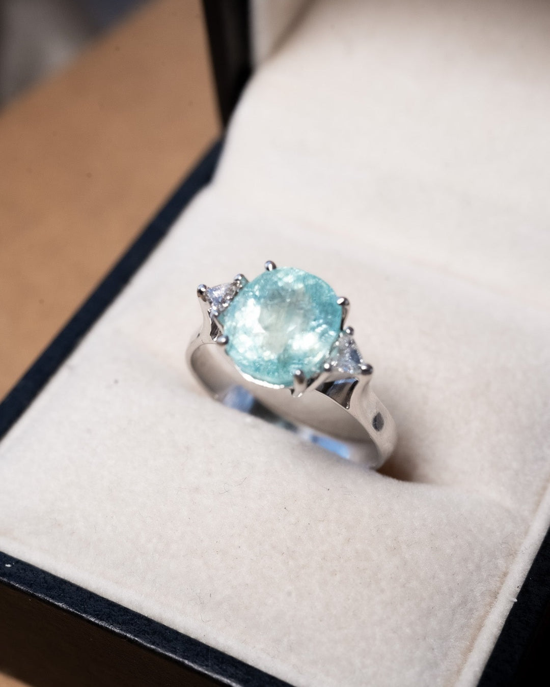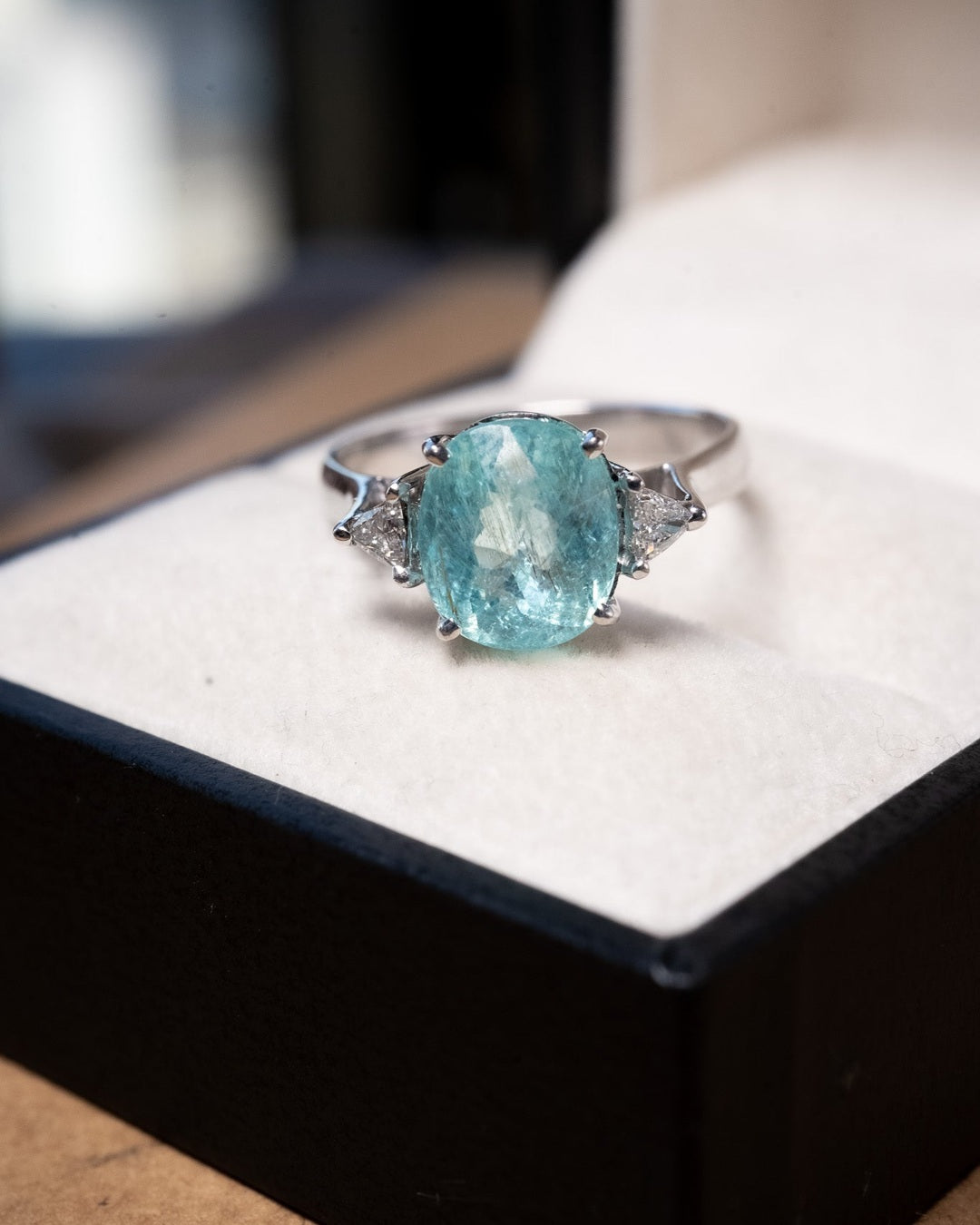 Anel solitário em ouro branco com turmalina paraíba de 2.50 quilates e dois diamantes trillion de 12 pontos cada.