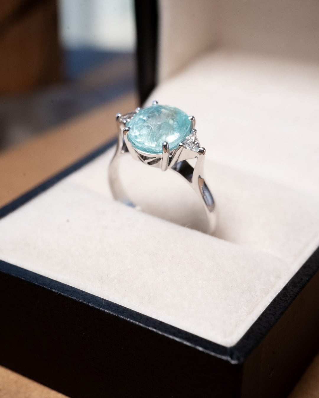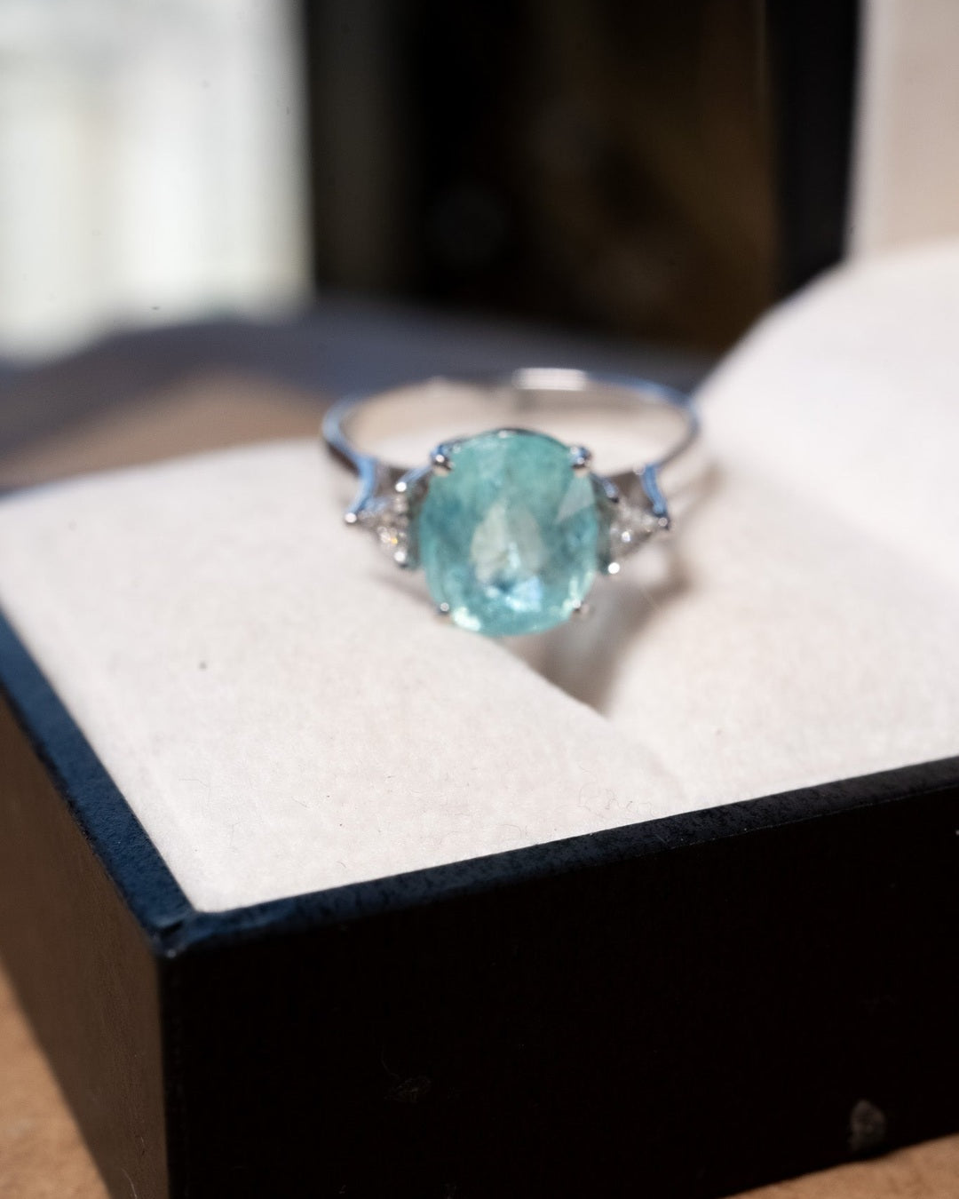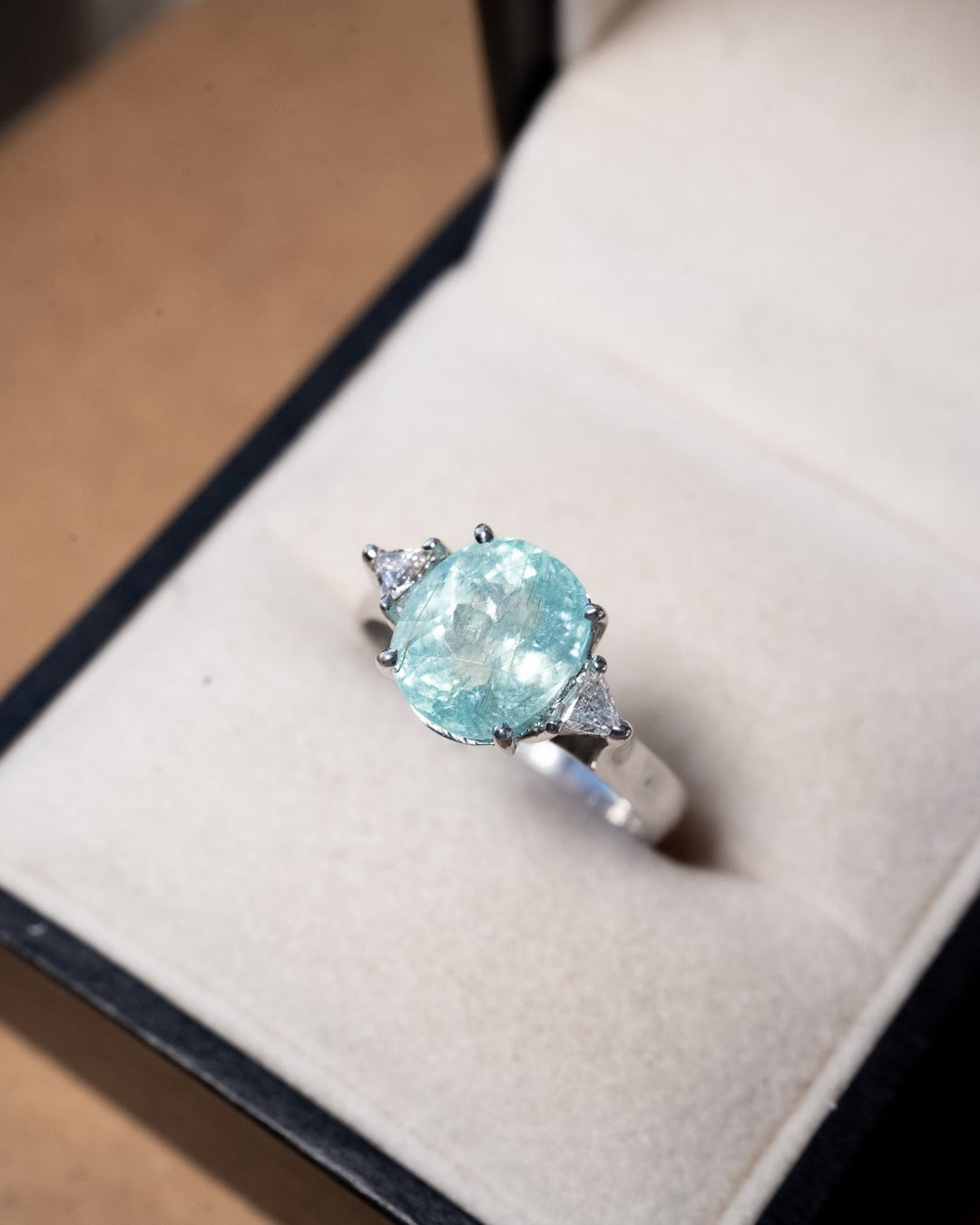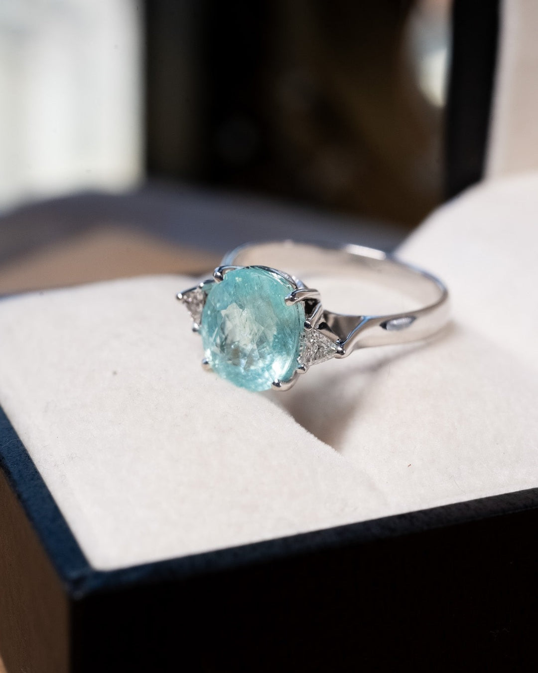 Anel solitário em ouro branco com turmalina paraíba de 2.50 quilates e dois diamantes trillion de 12 pontos cada.