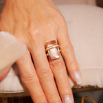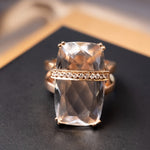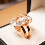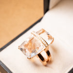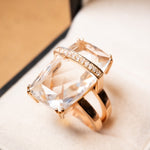 Anel de ouro rosê com diamantes e cristal de rocha. Largura 2.2cm. Aro 16. Peso 9.6g.