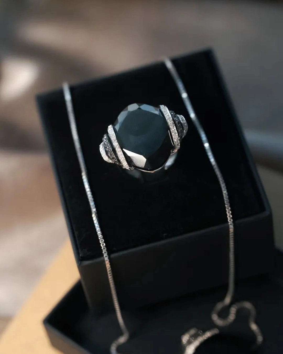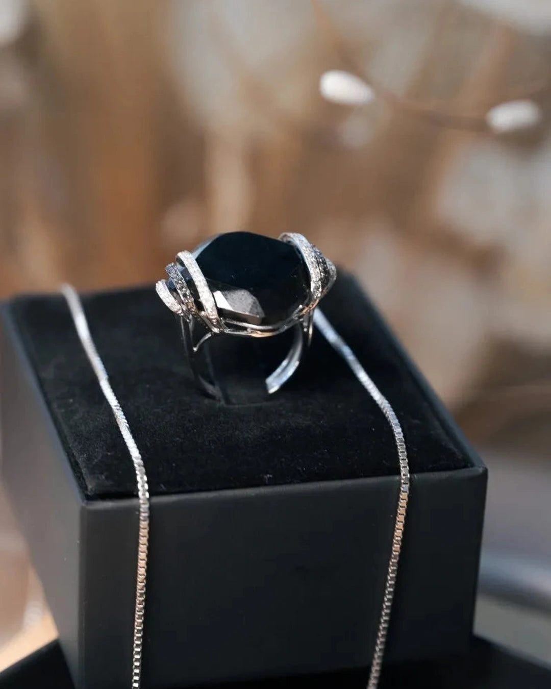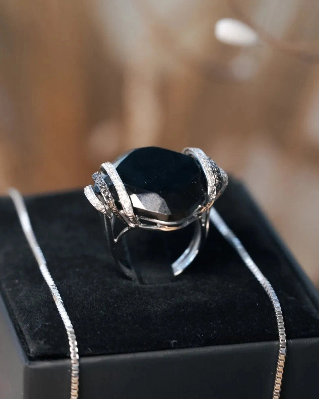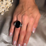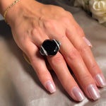 Anel Void em Ouro Branco, com Ônix natural medindo 25x25mm, acompanhado por diamantes brancos e negros de 0,01 ponto, disponível no aro 17, combina design contemporâneo e luxo refinado. peso 10,7 gramas