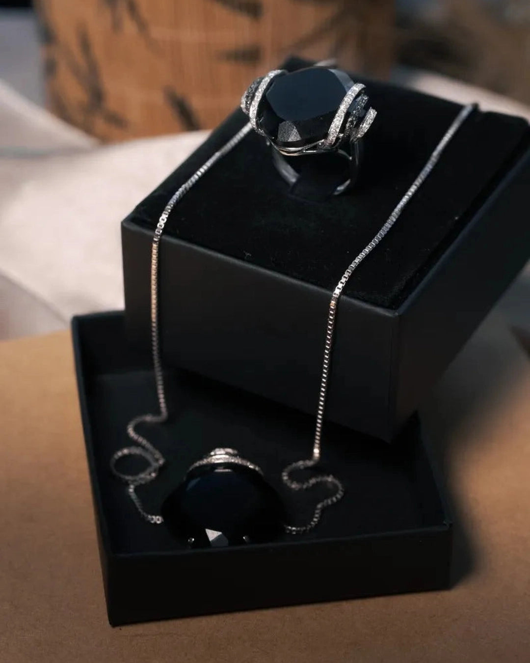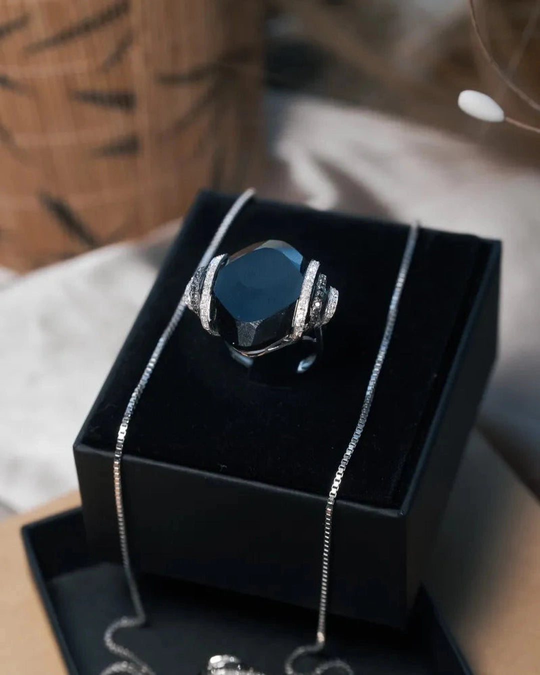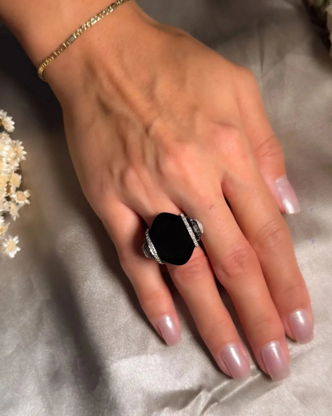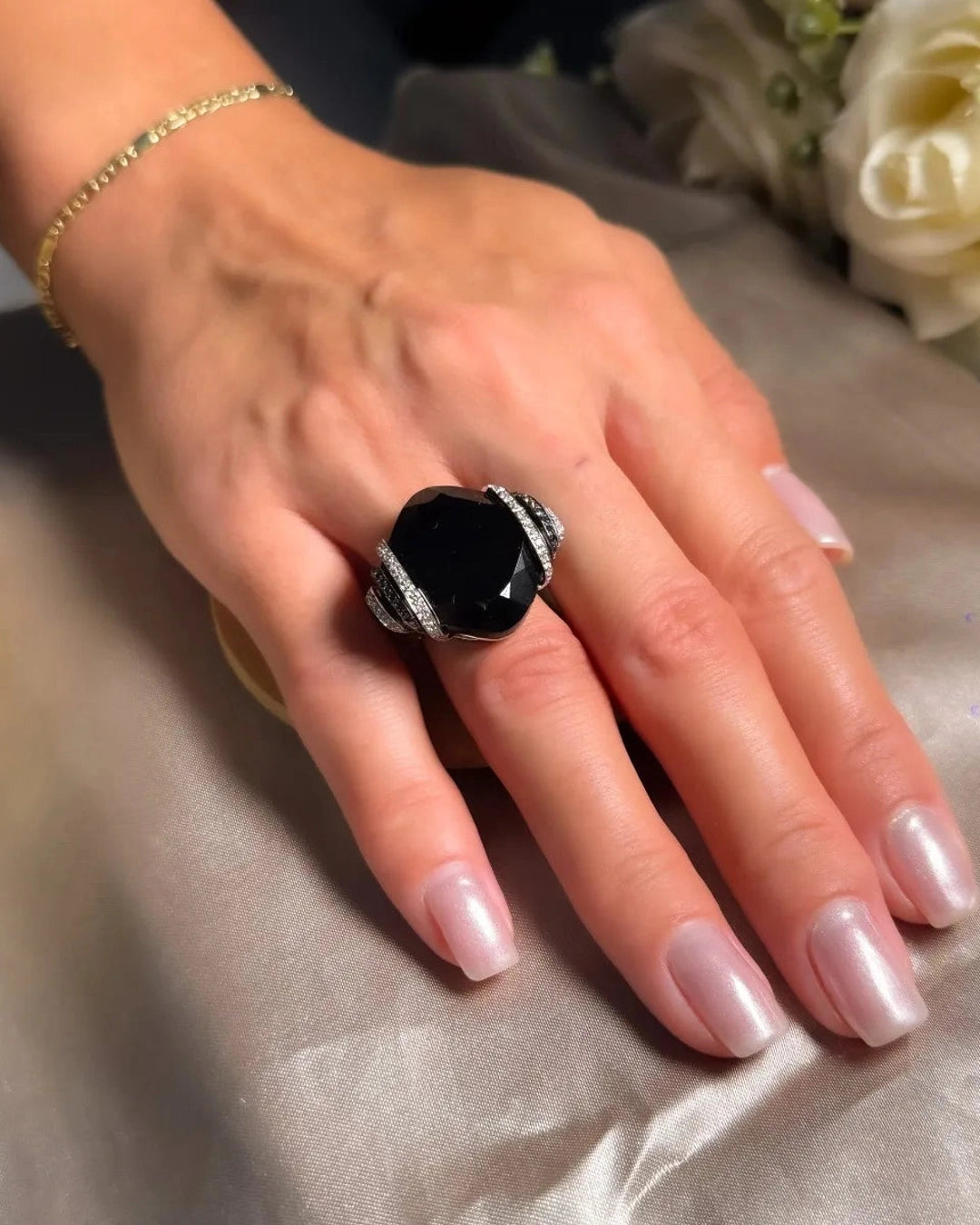 Anel Void em Ouro Branco, com Ônix natural medindo 25x25mm, acompanhado por diamantes brancos e negros de 0,01 ponto, disponível no aro 17, combina design contemporâneo e luxo refinado. peso 10,7 gramas