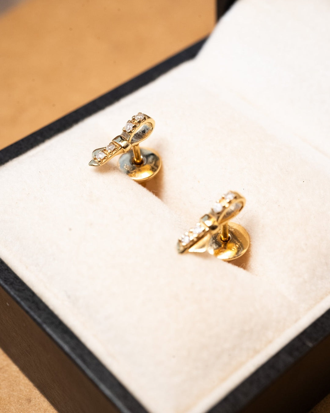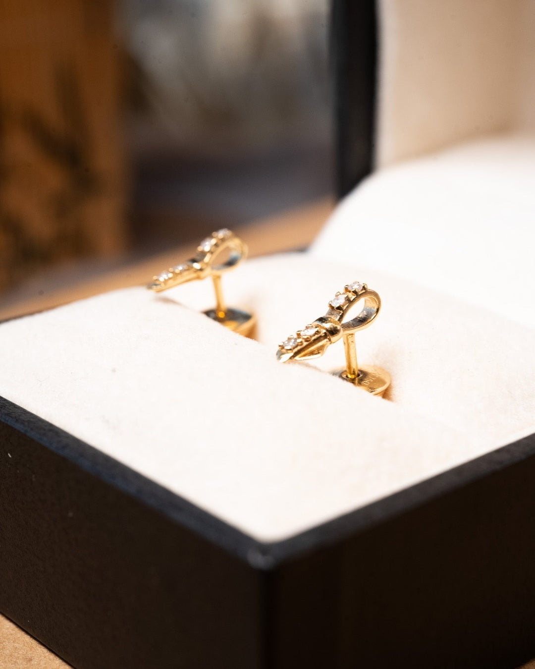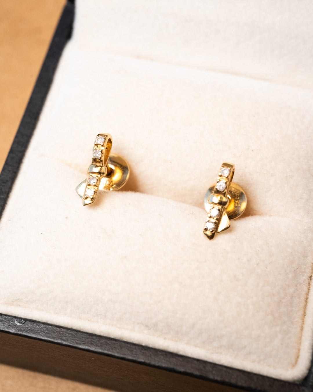 Brinco lacinho Vivara de ouro amarelo com diamantes. Medidas 1.0cm x 0.3cm e peso 1.4g.