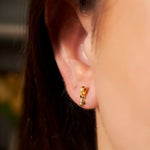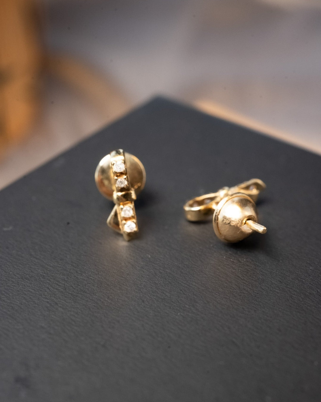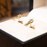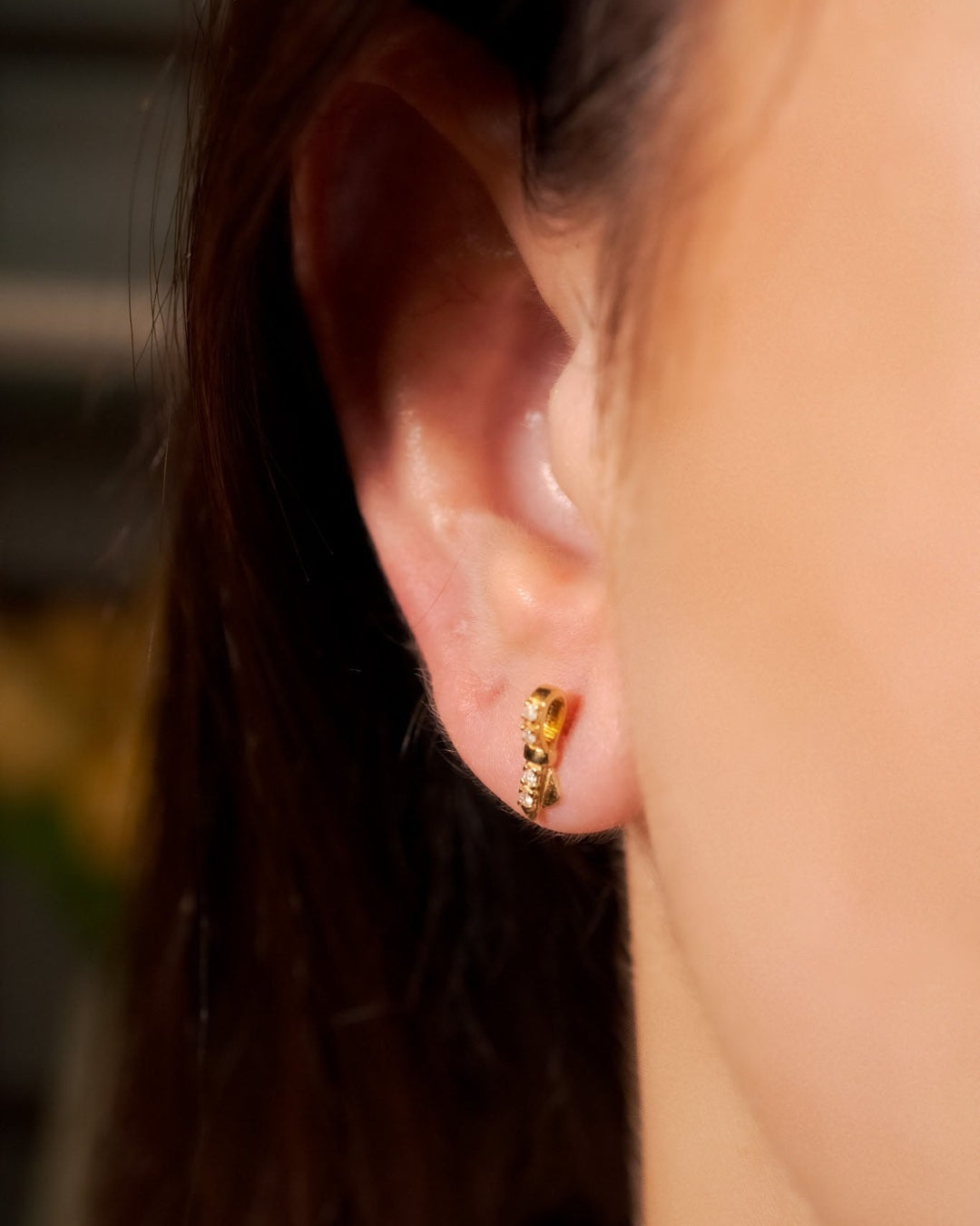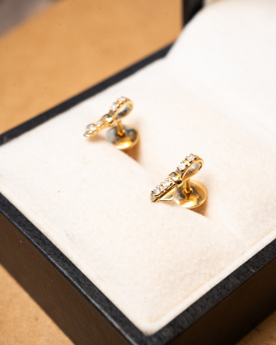 Brinco lacinho Vivara de ouro amarelo com diamantes. Medidas 1.0cm x 0.3cm e peso 1.4g.