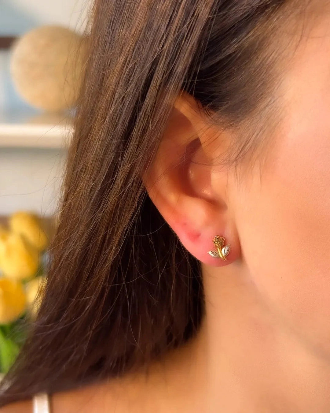 Brincos Baby Flower confeccionados em ouro amarelo, branco e rosê, com medidas de 0,9 cm de comprimento por 0,8 cm de largura. peso 0,9 gramas