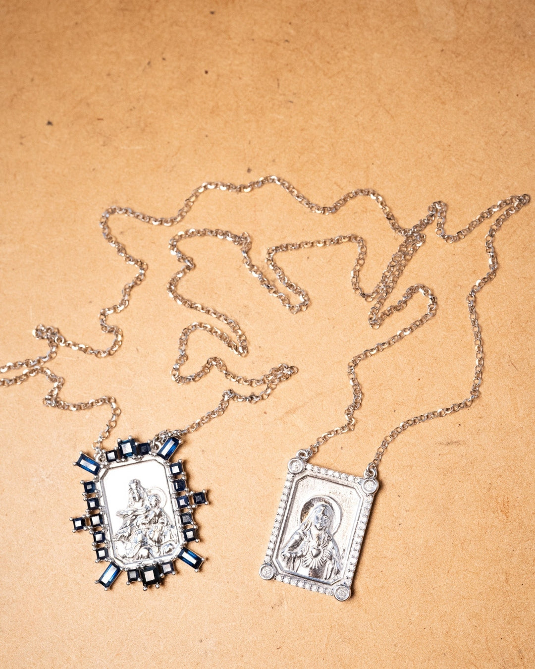 Colar Escapulário De Ouro Branco Cravejado De Diamantes E Safiras