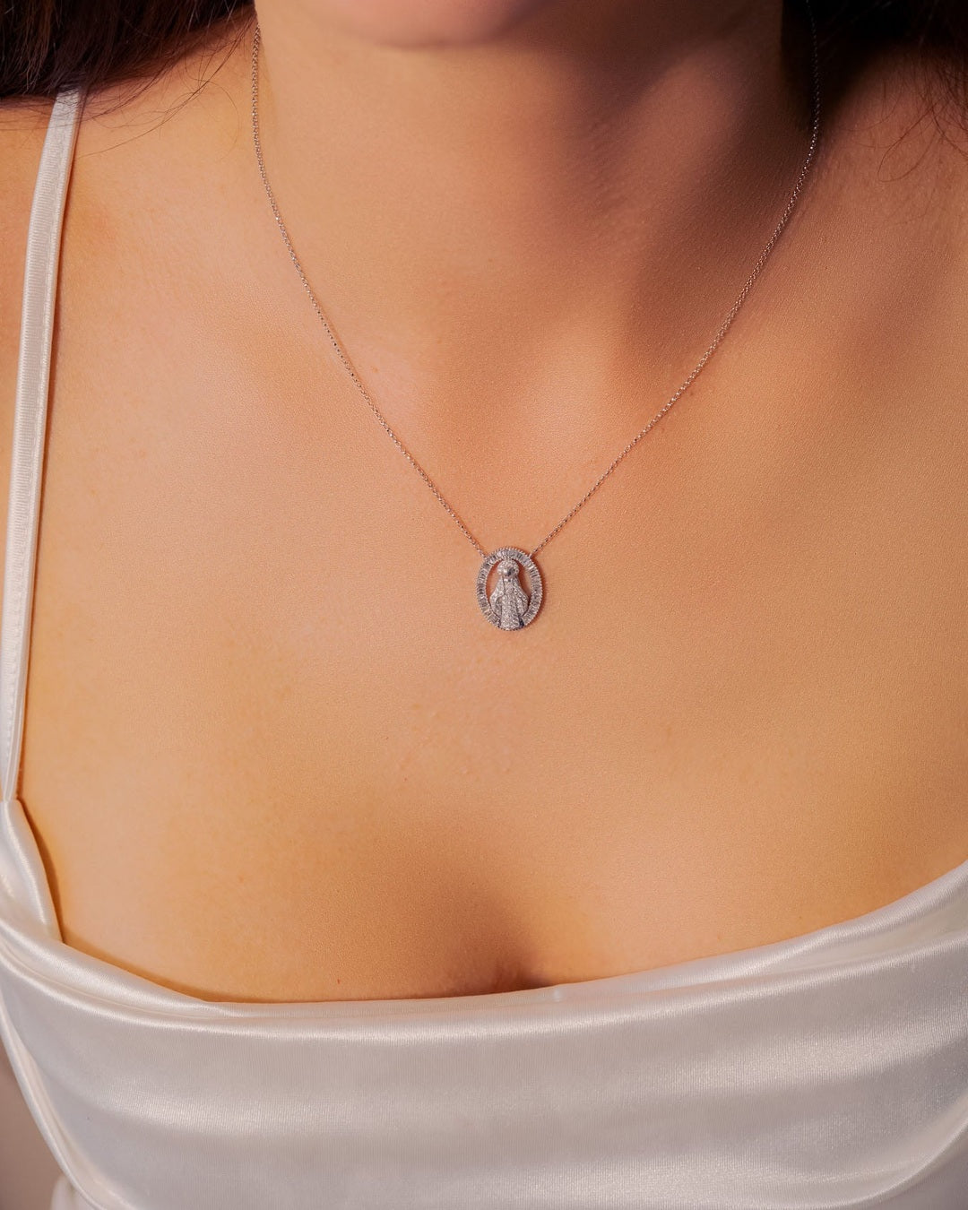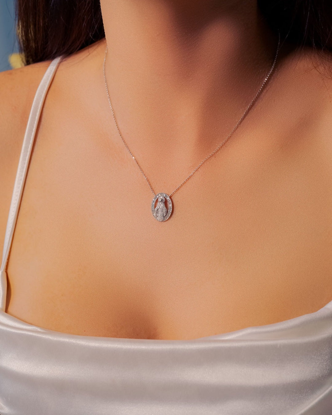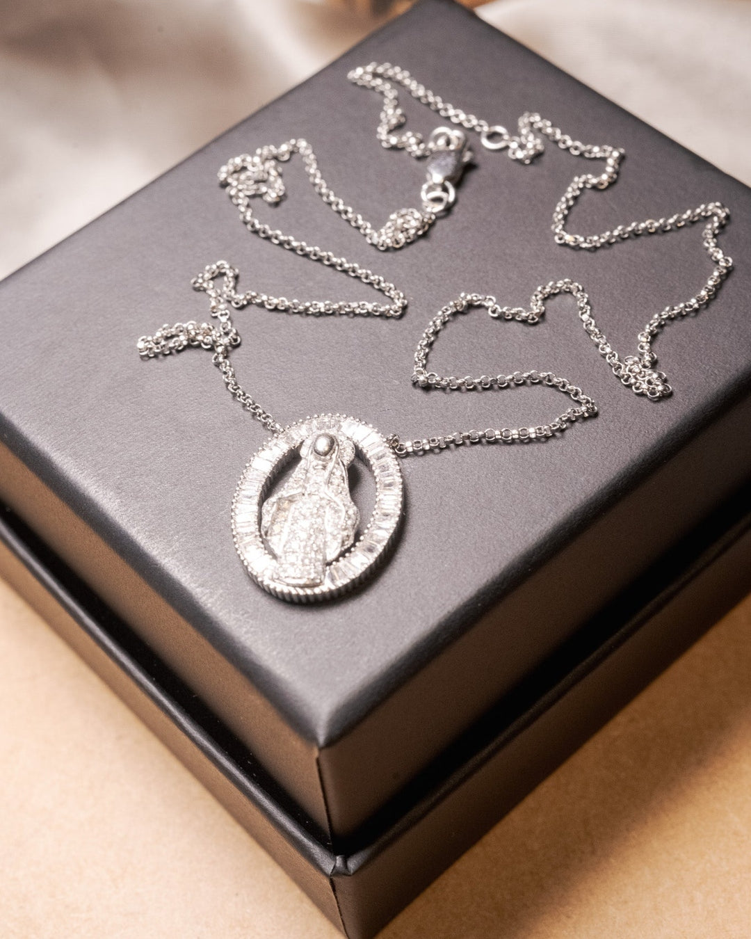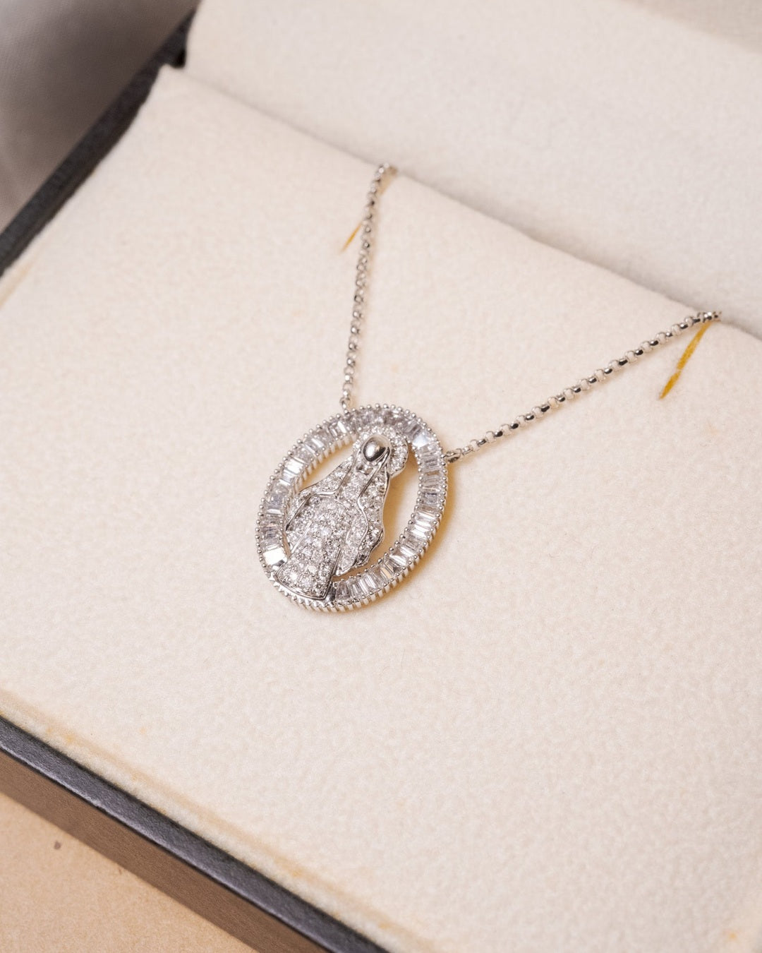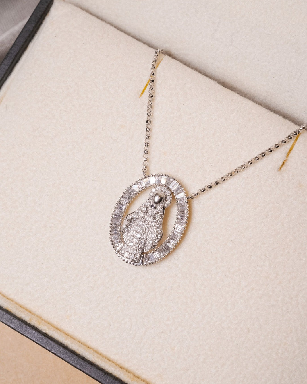 Colar de ouro branco com pingente de Nossa Senhora Aparecida e diamantes baguete e brilhante.