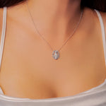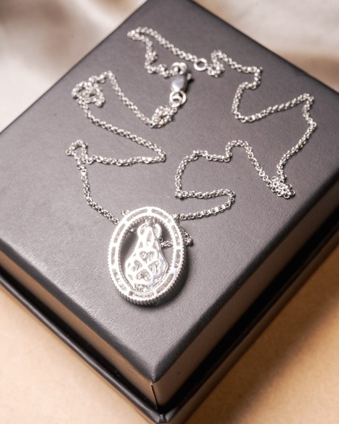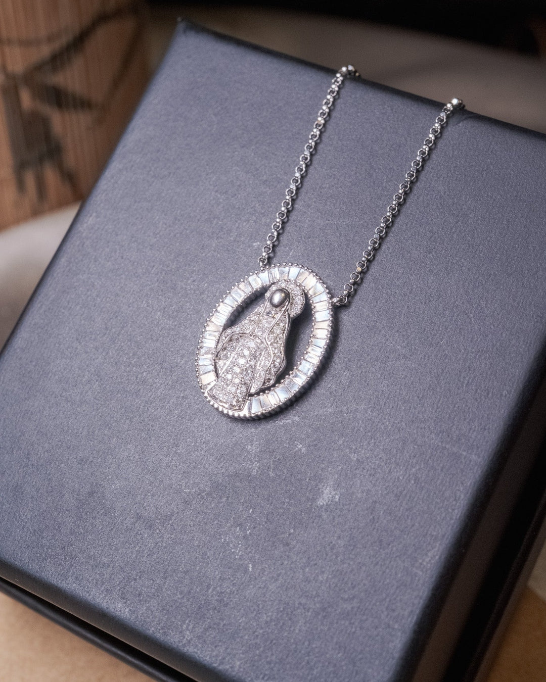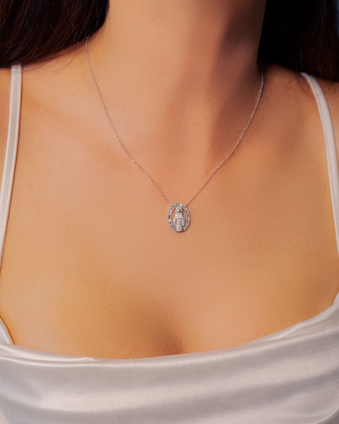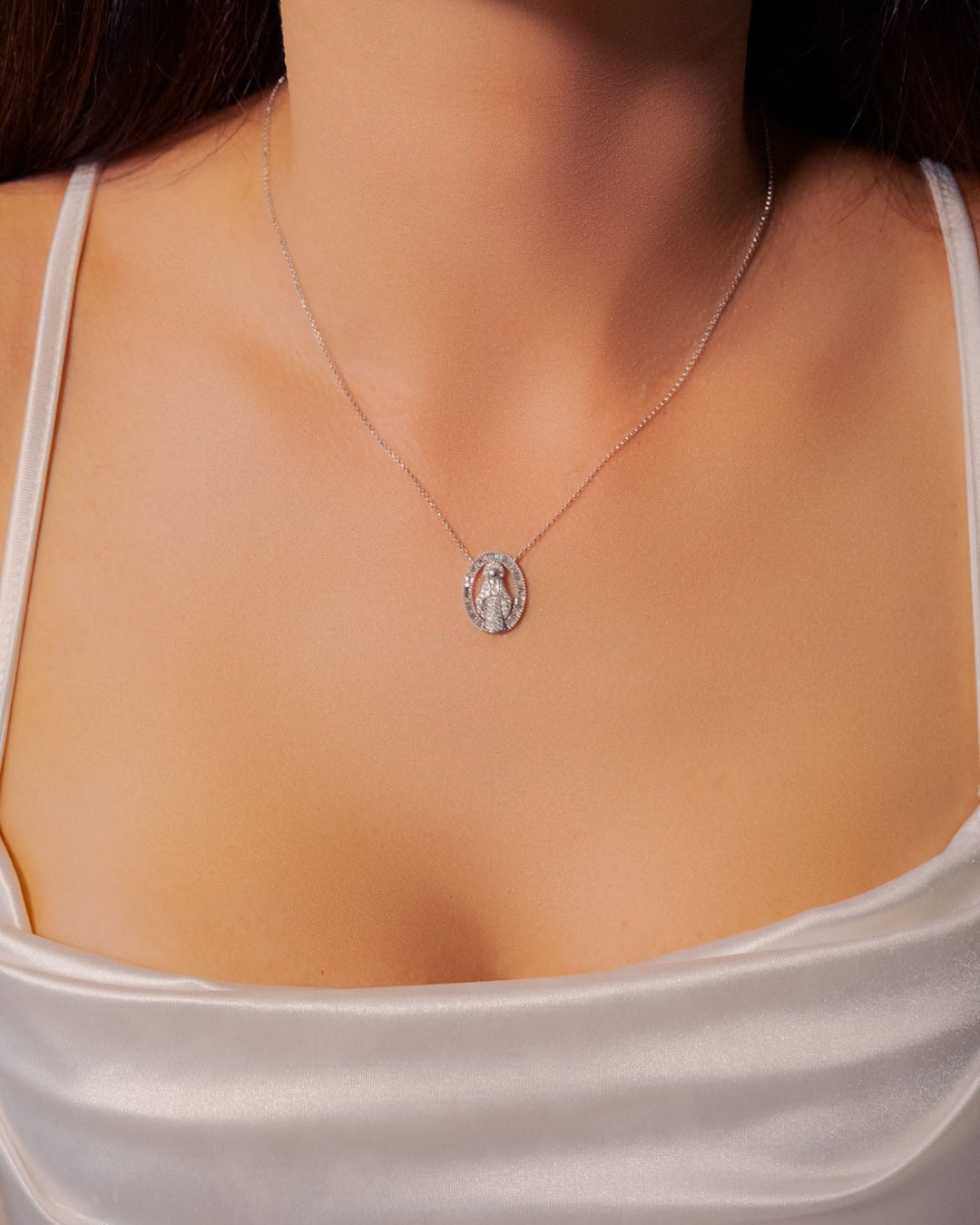 Colar de ouro branco com pingente de Nossa Senhora Aparecida e diamantes baguete e brilhante.