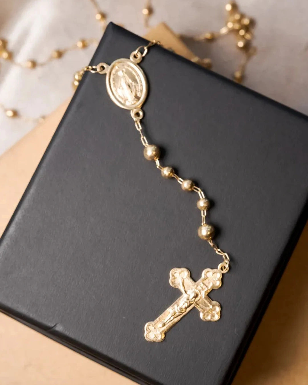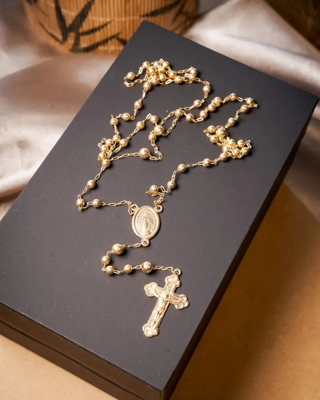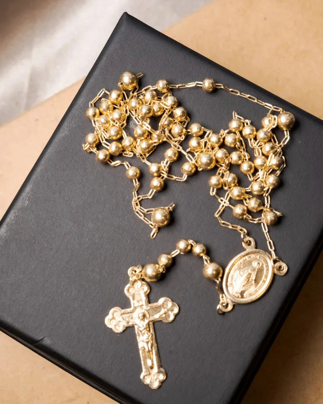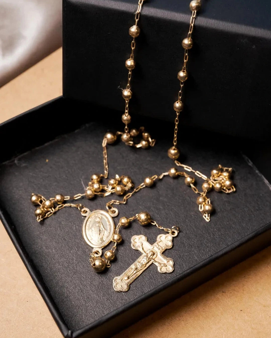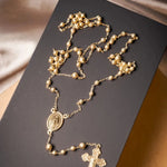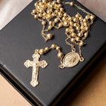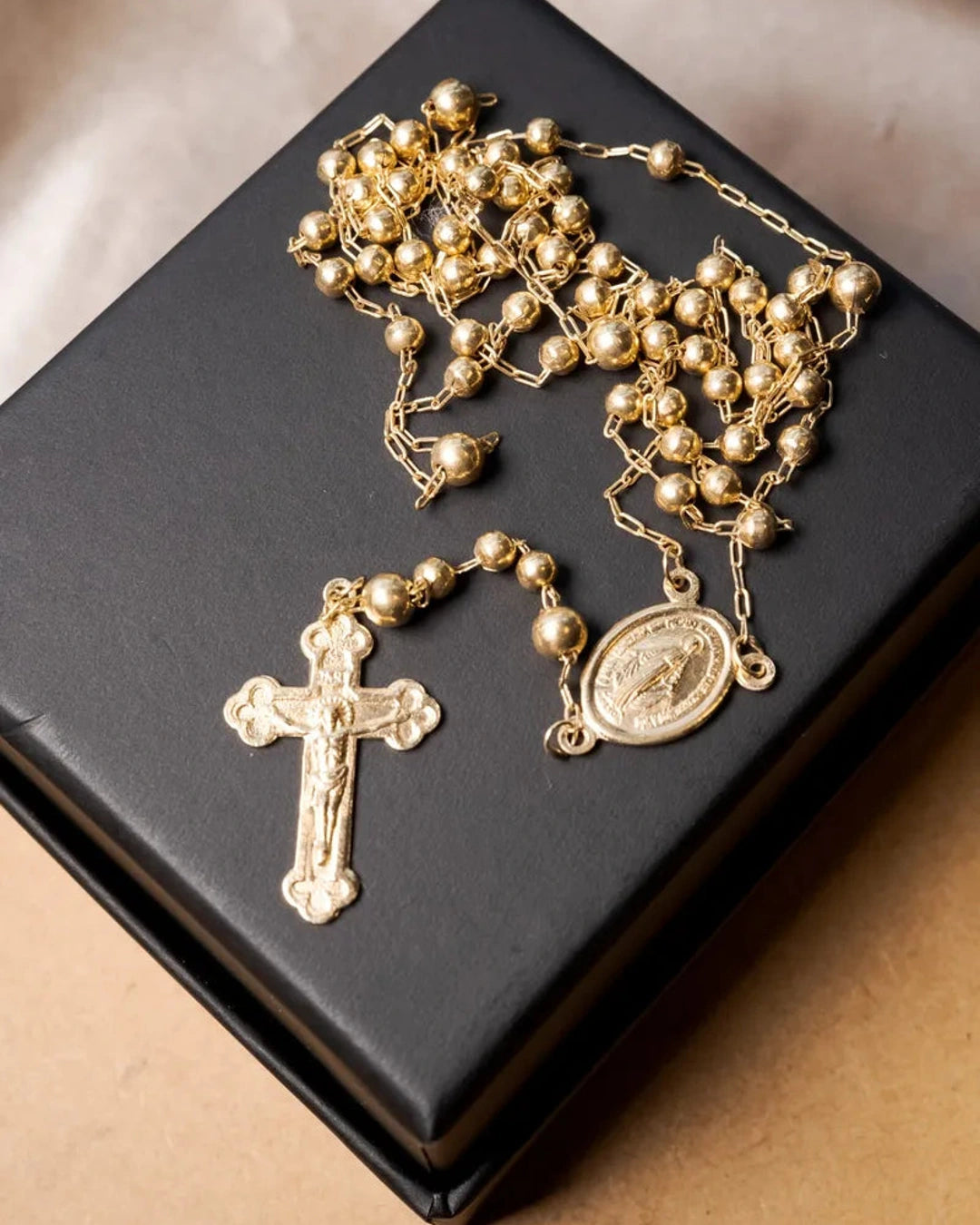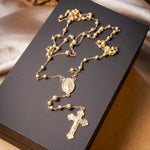 Este colar terço em ouro amarelo apresenta elos no estilo Cartier e inclui pingentes de crucifixo e Virgem Maria, com comprimento total de 80 centímetros, combinando tradição e elegância. peso 9 gramas