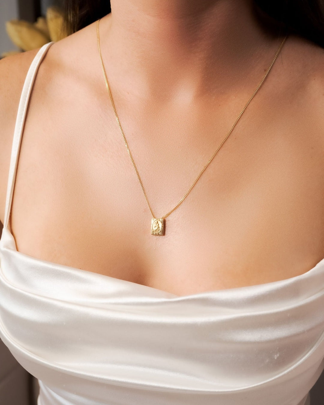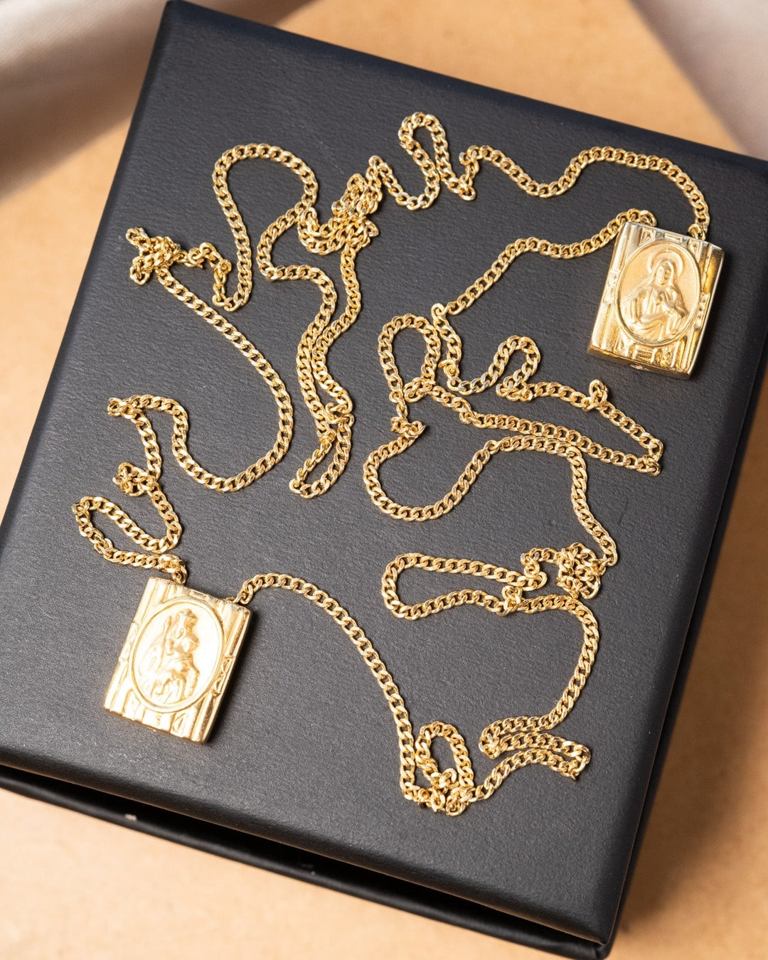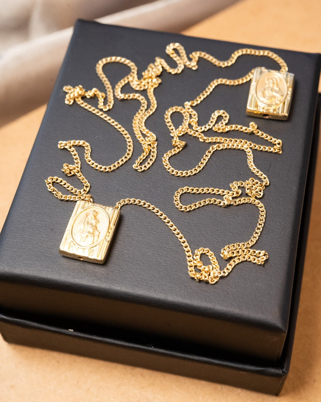 Escapulário de ouro amarelo com elos grumet e imagens do Sagrado Coração de Jesus e Nossa Senhora do Sagrado Coração.