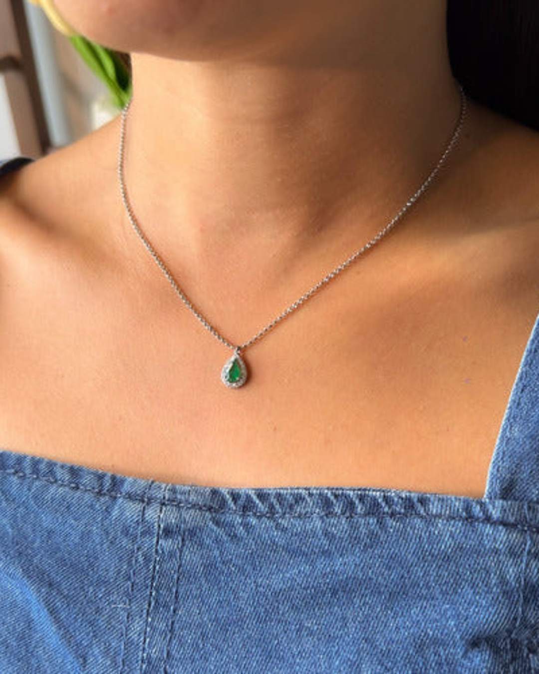 Gargantilha Em Ouro Branco Com Gota De Esmeralda E Diamantes