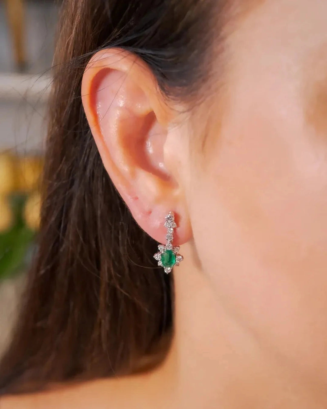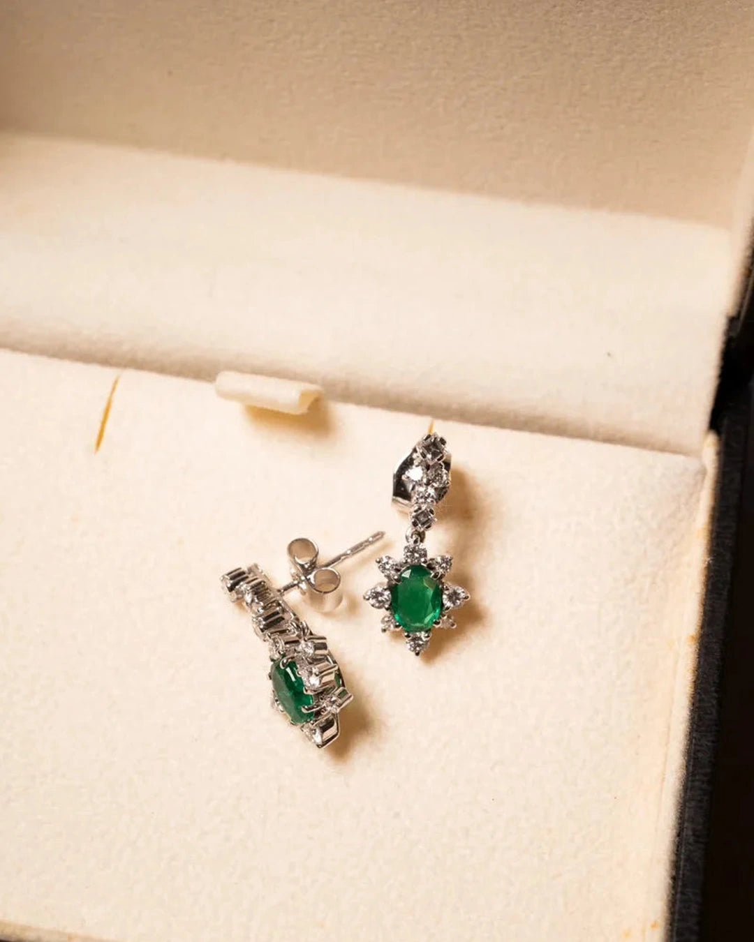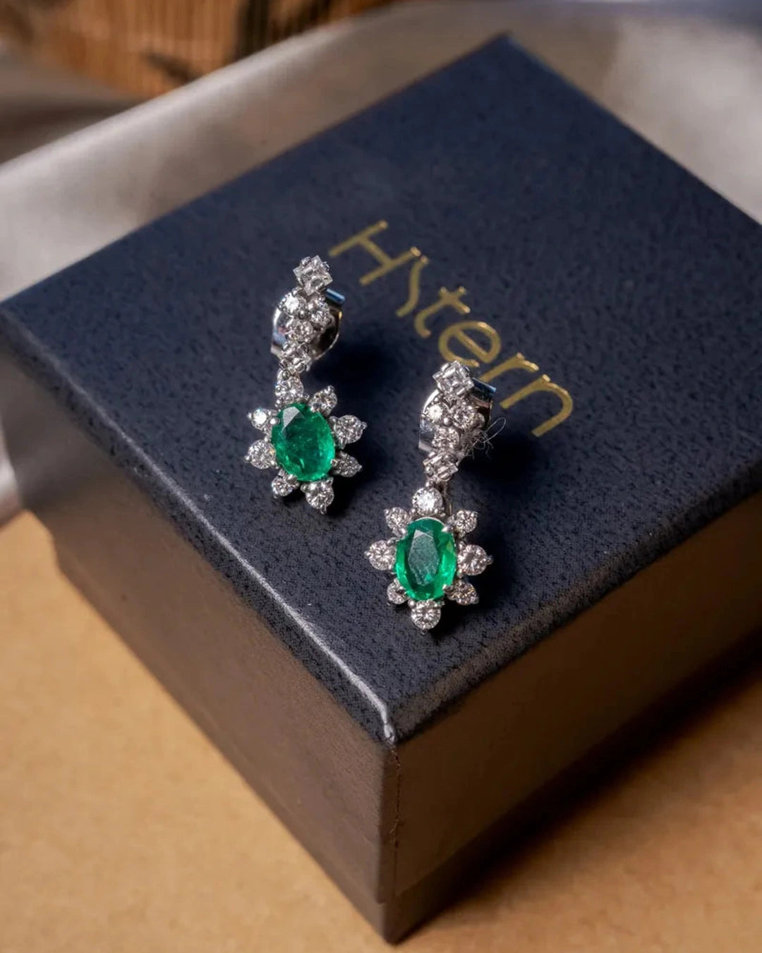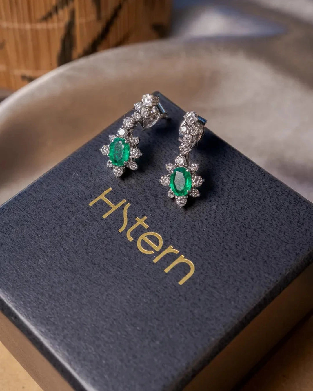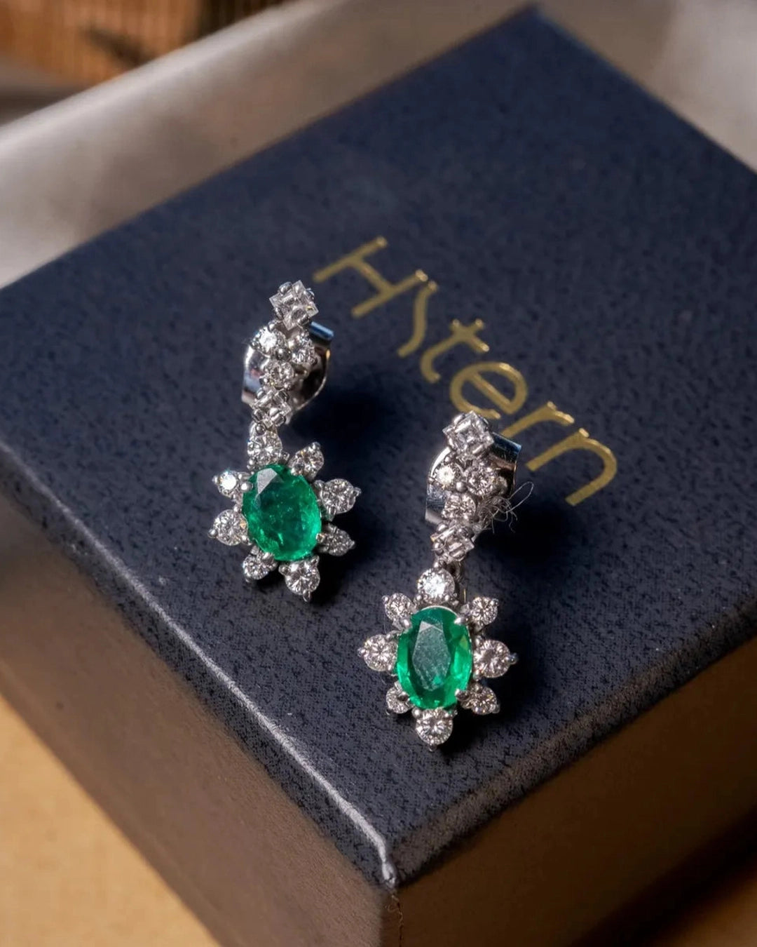 Brincos pendentes Hstern em ouro branco, adornados com esmeralda e diamantes. Medem 2,0 cm de comprimento por 1,0 cm de largura, combinando materiais nobres para um visual sofisticado e elegante. peso 4,4 gramas.