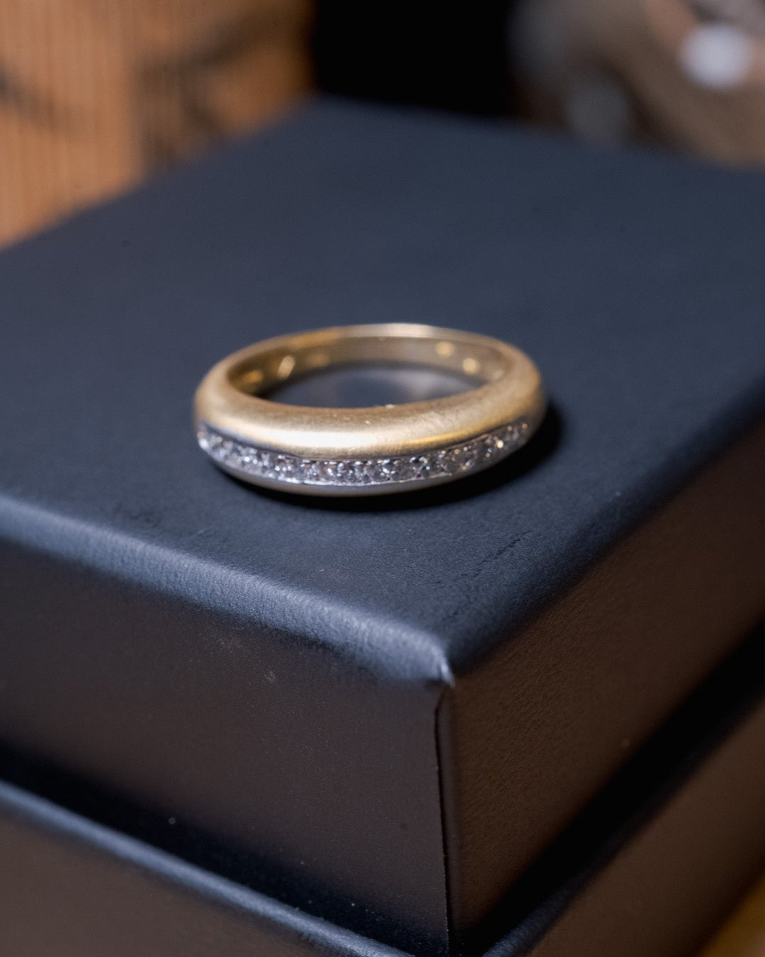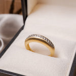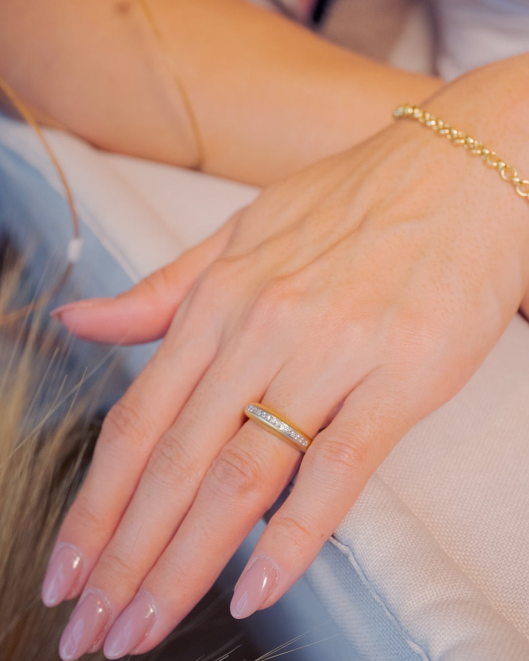 Anel meia aliança em ouro amarelo com 15 diamantes de 0.2 pontos cada e peso de 4.7g.