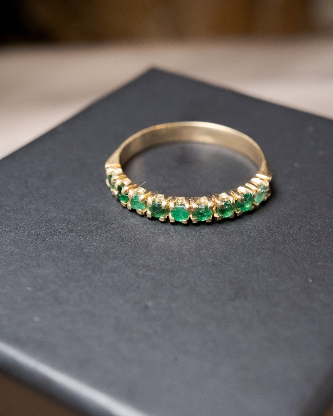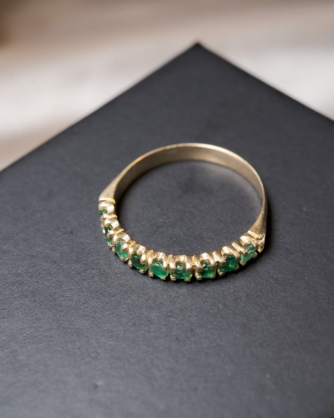 Anel meia aliança em ouro amarelo com 09 esmeraldas de 0.6 pontos cada e peso de 2.8g. Aro 25.