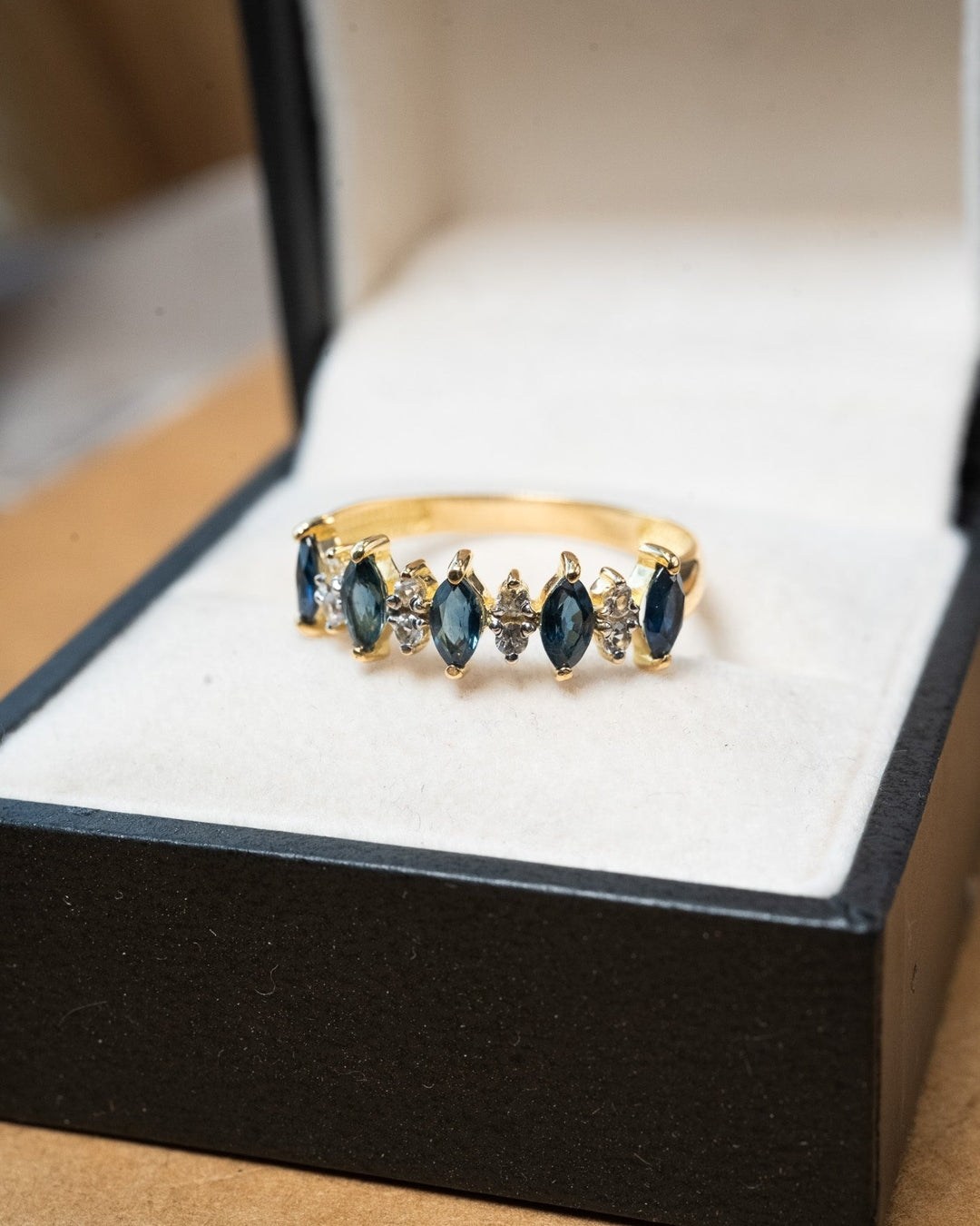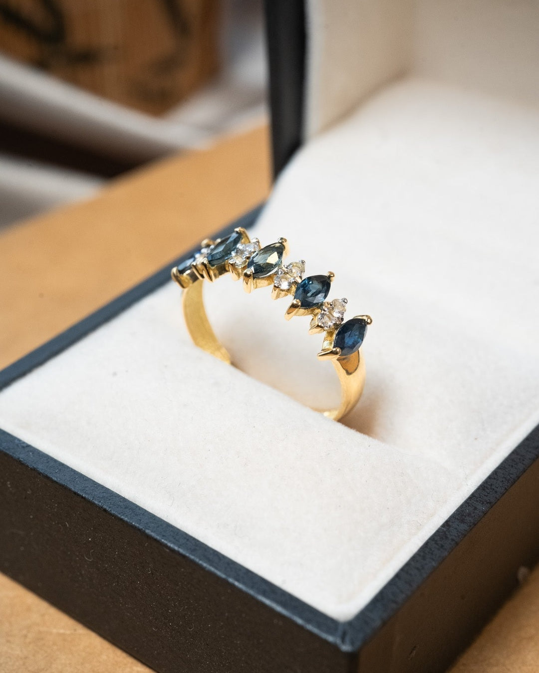 Anel meia aliança em ouro amarelo com safiras azuis navette de 0.15ct e diamantes brilhantes de 0.04ct.