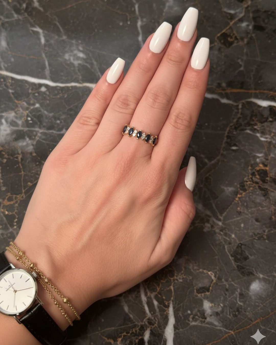 Título: Anel Meia Aliança Navette Em Ouro Amarelo Com Safiras E Diamantes