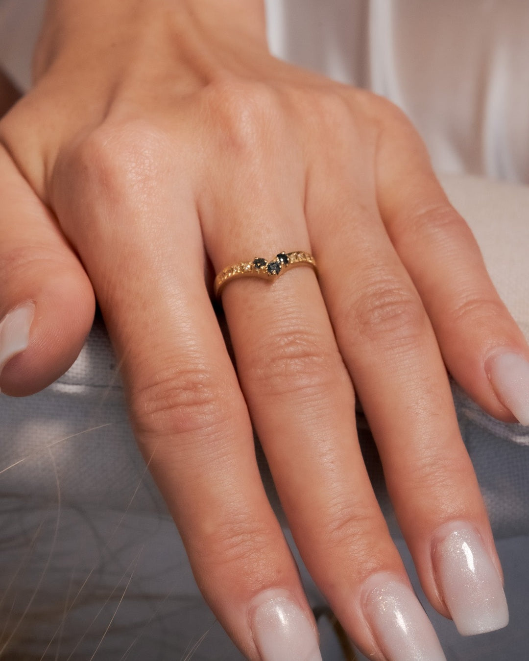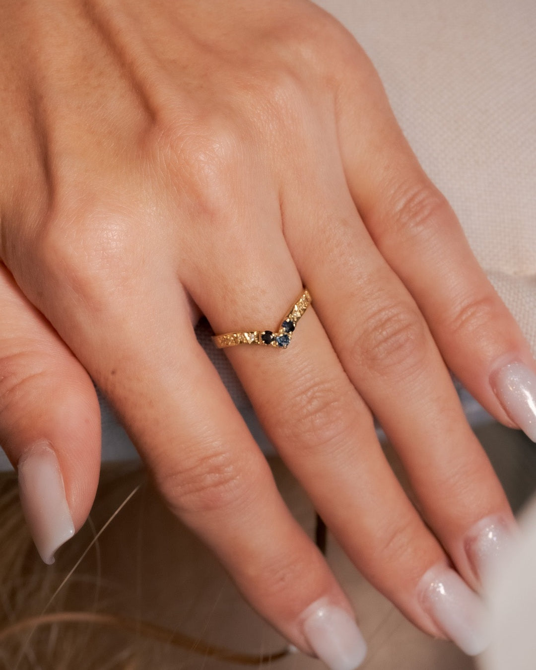 Título: Anel Moderno Em Ouro Amarelo Com Diamantes E Safiras Azuis