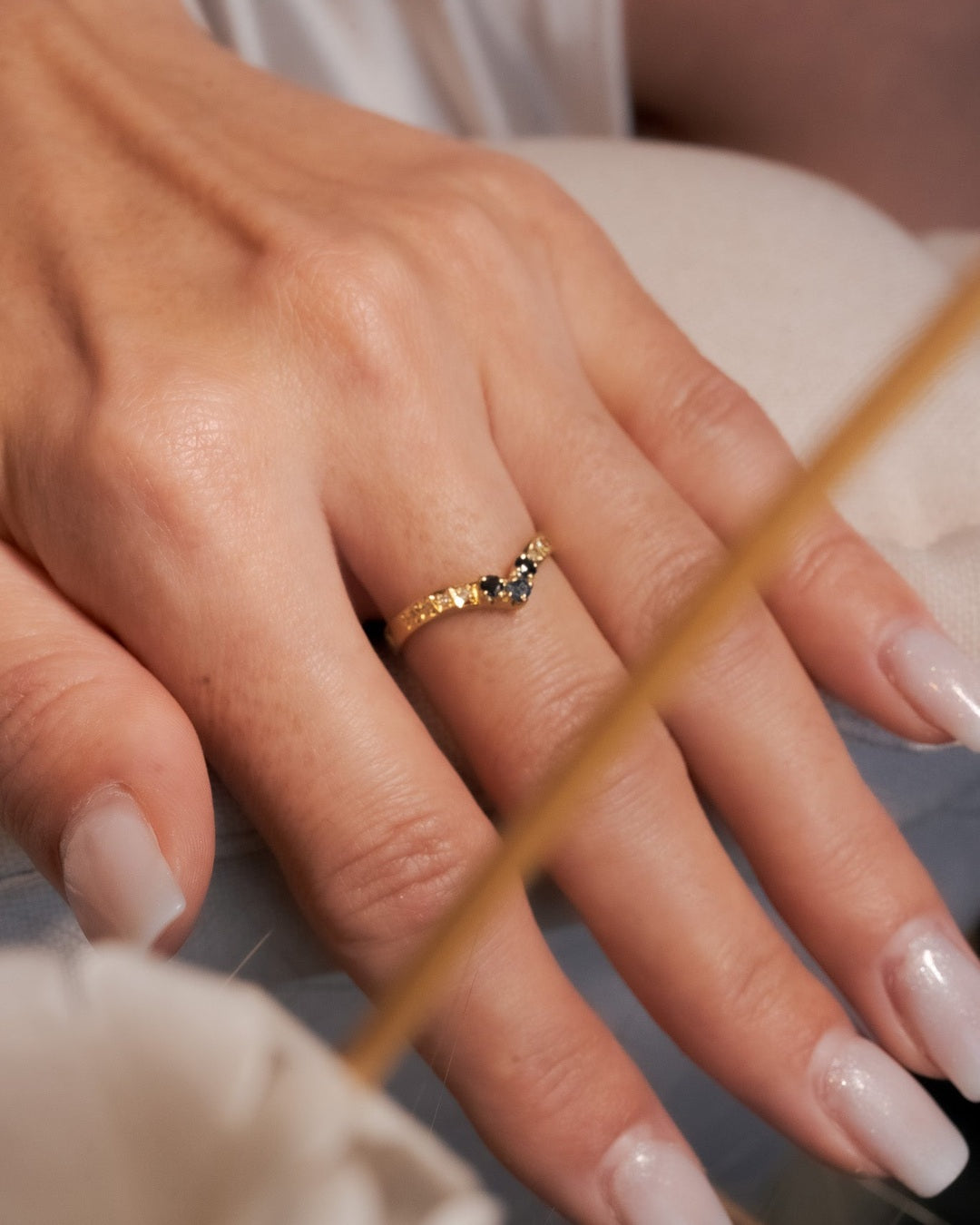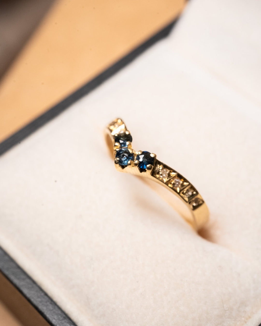 Anel Meia Aliança Em Ouro Amarelo, Diamantes e Safiras