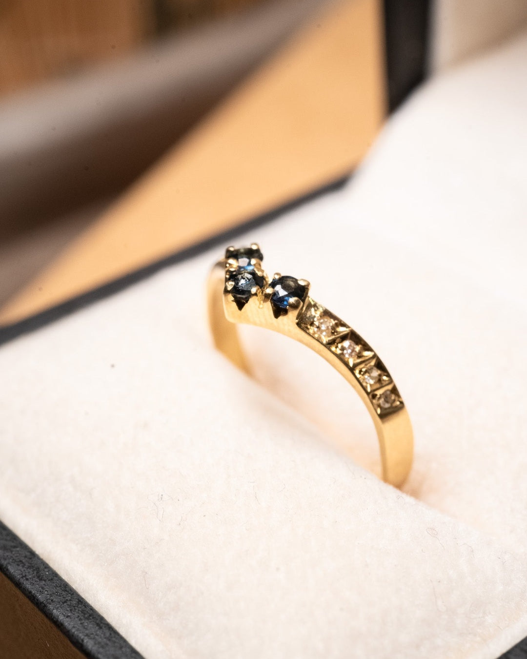 Anel moderno em ouro amarelo com 3 safiras azuis de 0.4 pontos e 8 diamantes de 0.1 ponto. Peso 1.9g. Aro 20.5.