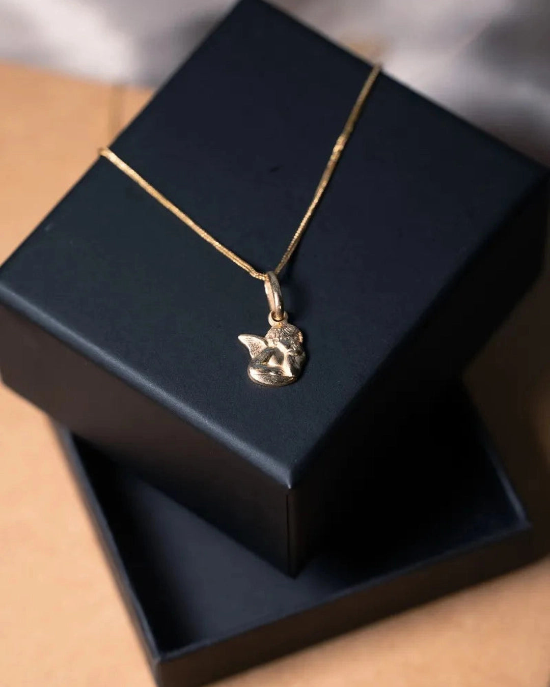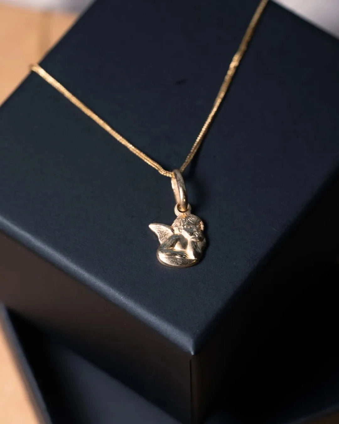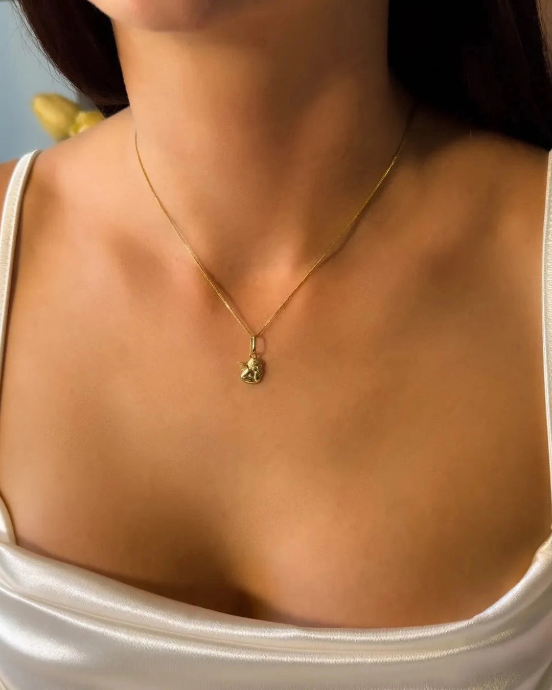 Pingente em ouro amarelo, sem diamantes, com dimensões de 2,0 cm de comprimento por 1,0 cm de largura, apresentando um design refinado e simbólico de anjo da guarda. peso 2,0 gramas