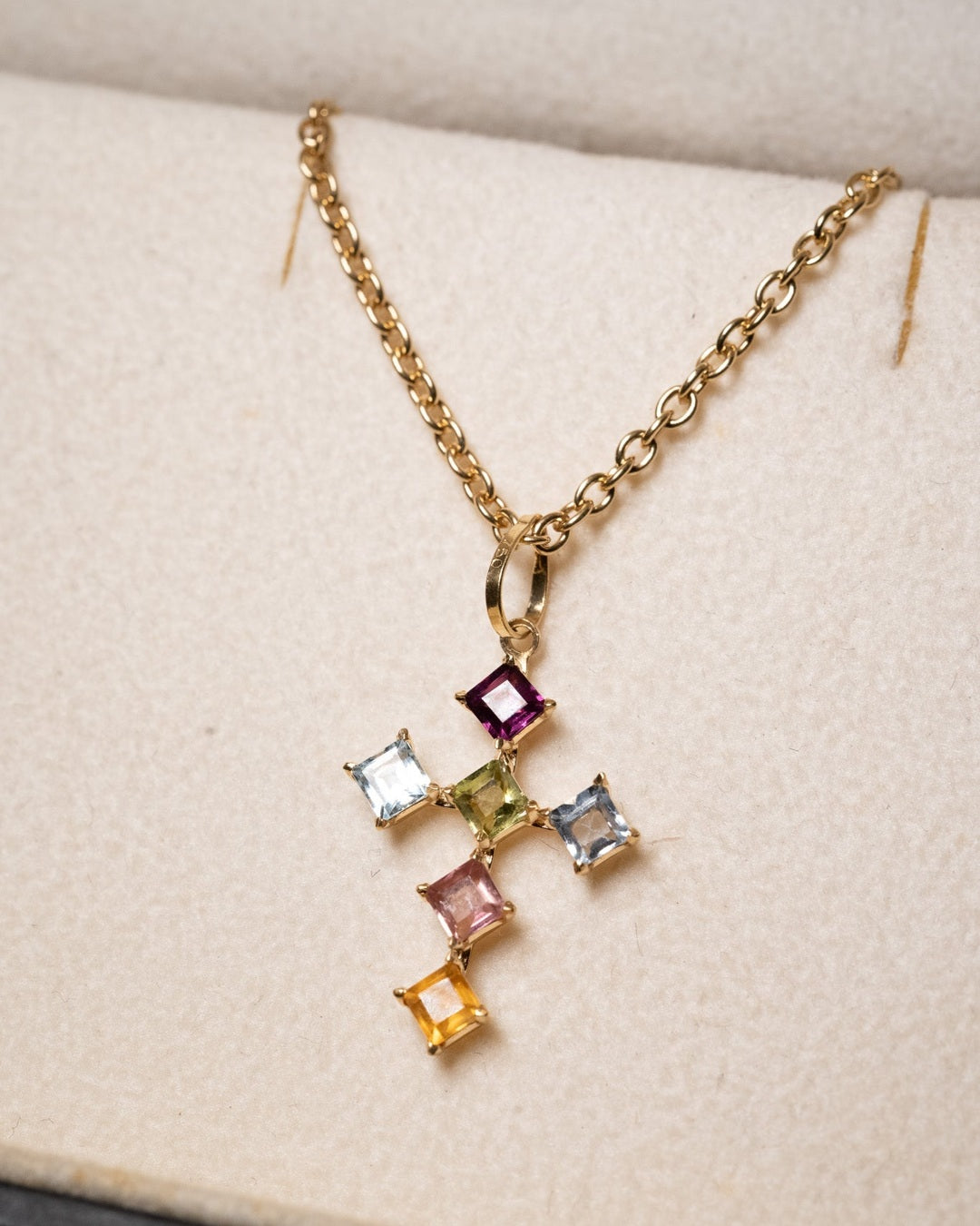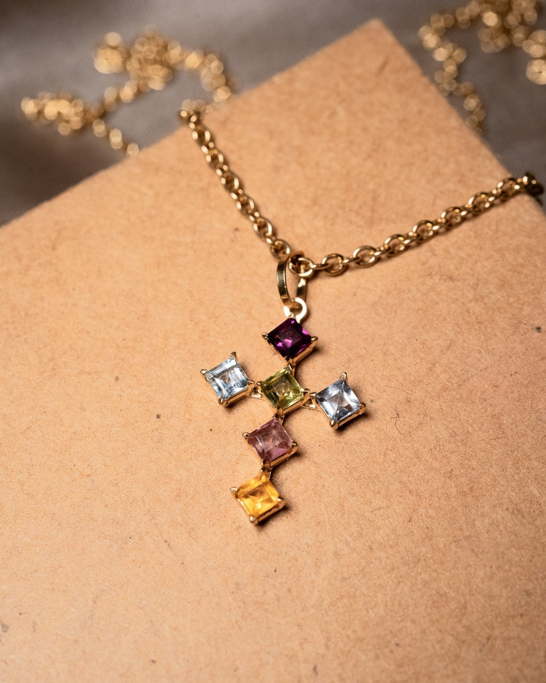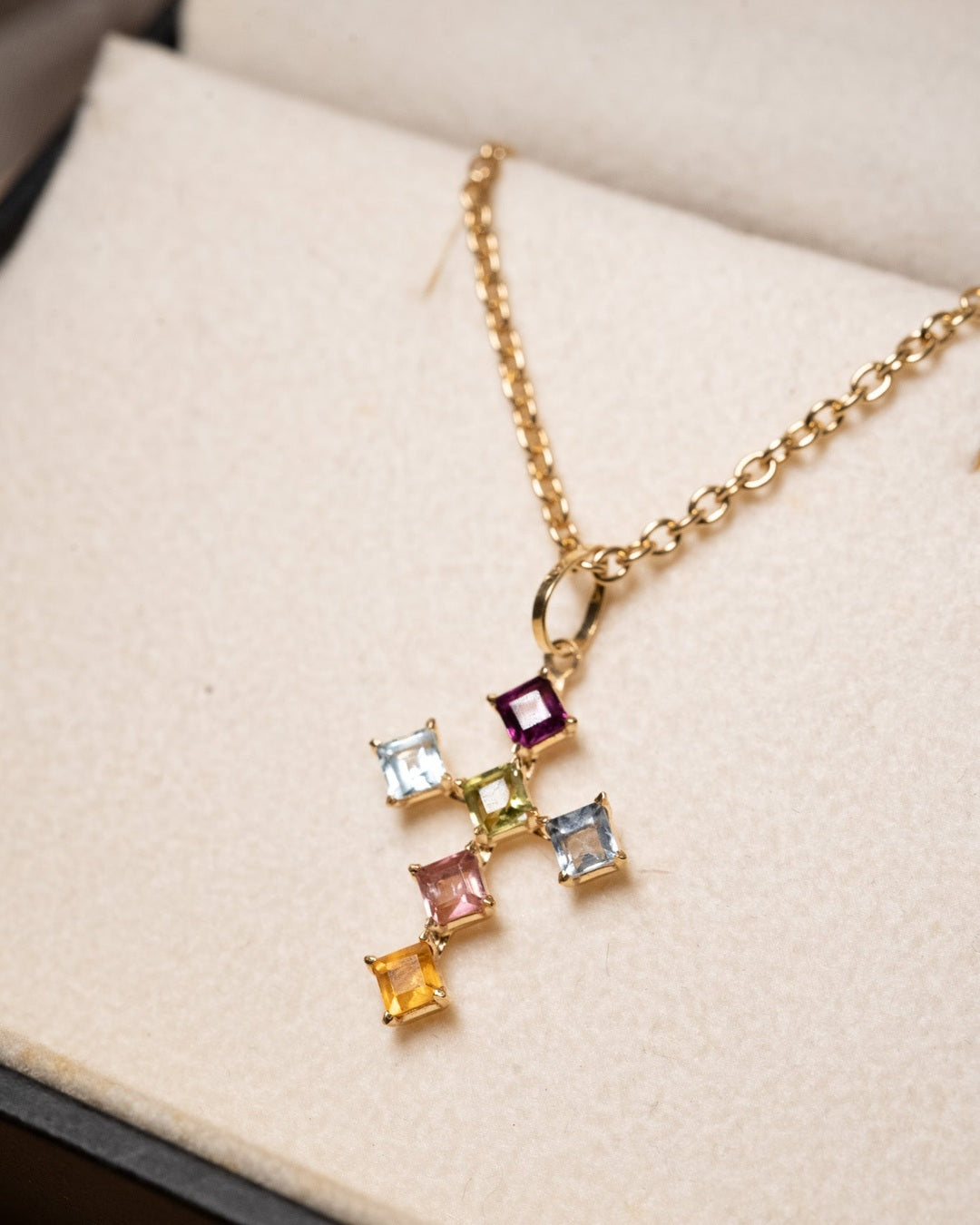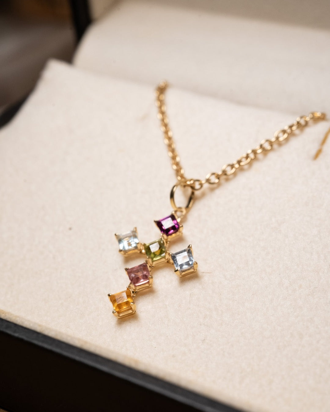 Pingente Cruz em Ouro Amarelo e Pedras Brasileiras