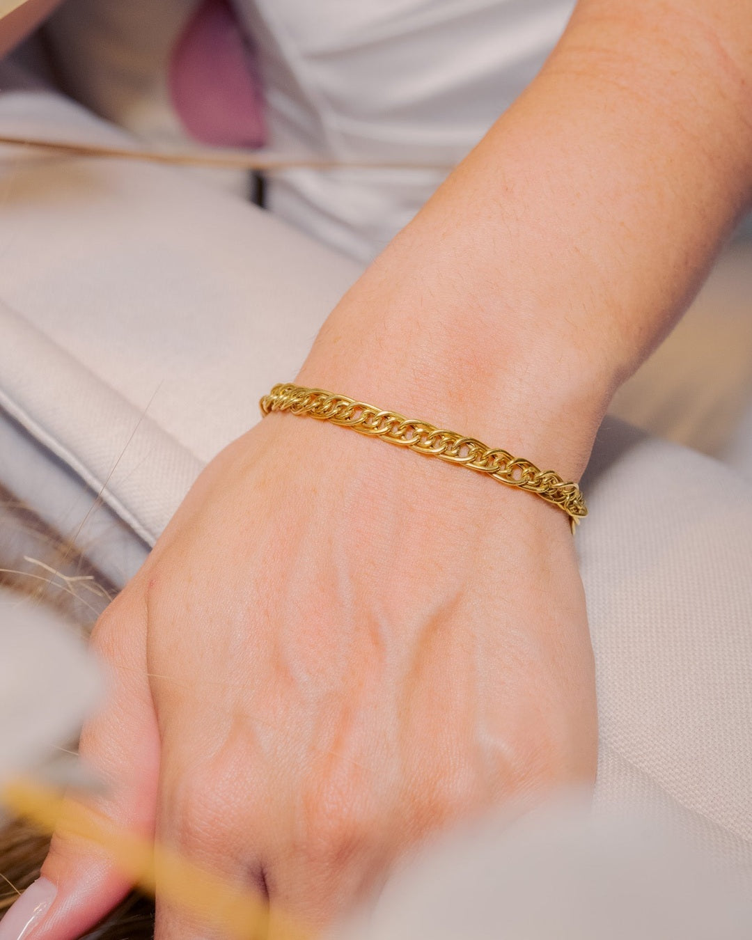 Pulseira grummet em ouro amarelo com 19cm de comprimento e 0.6cm de espessura pesando 5.4g.