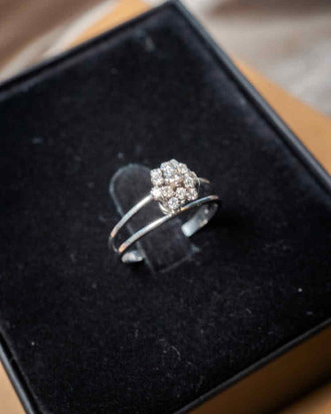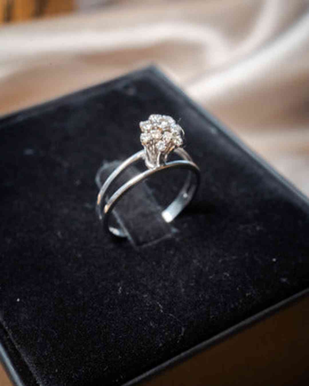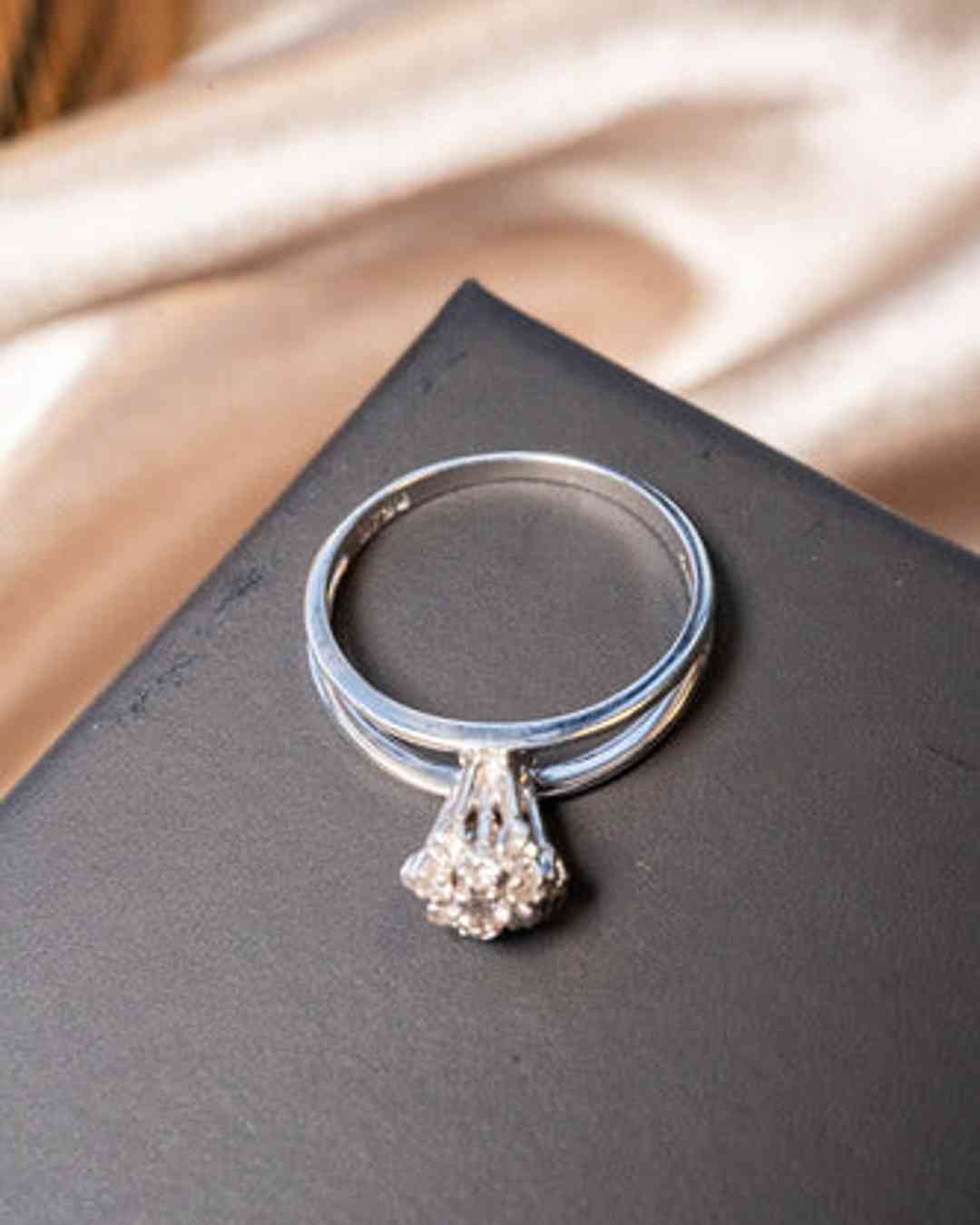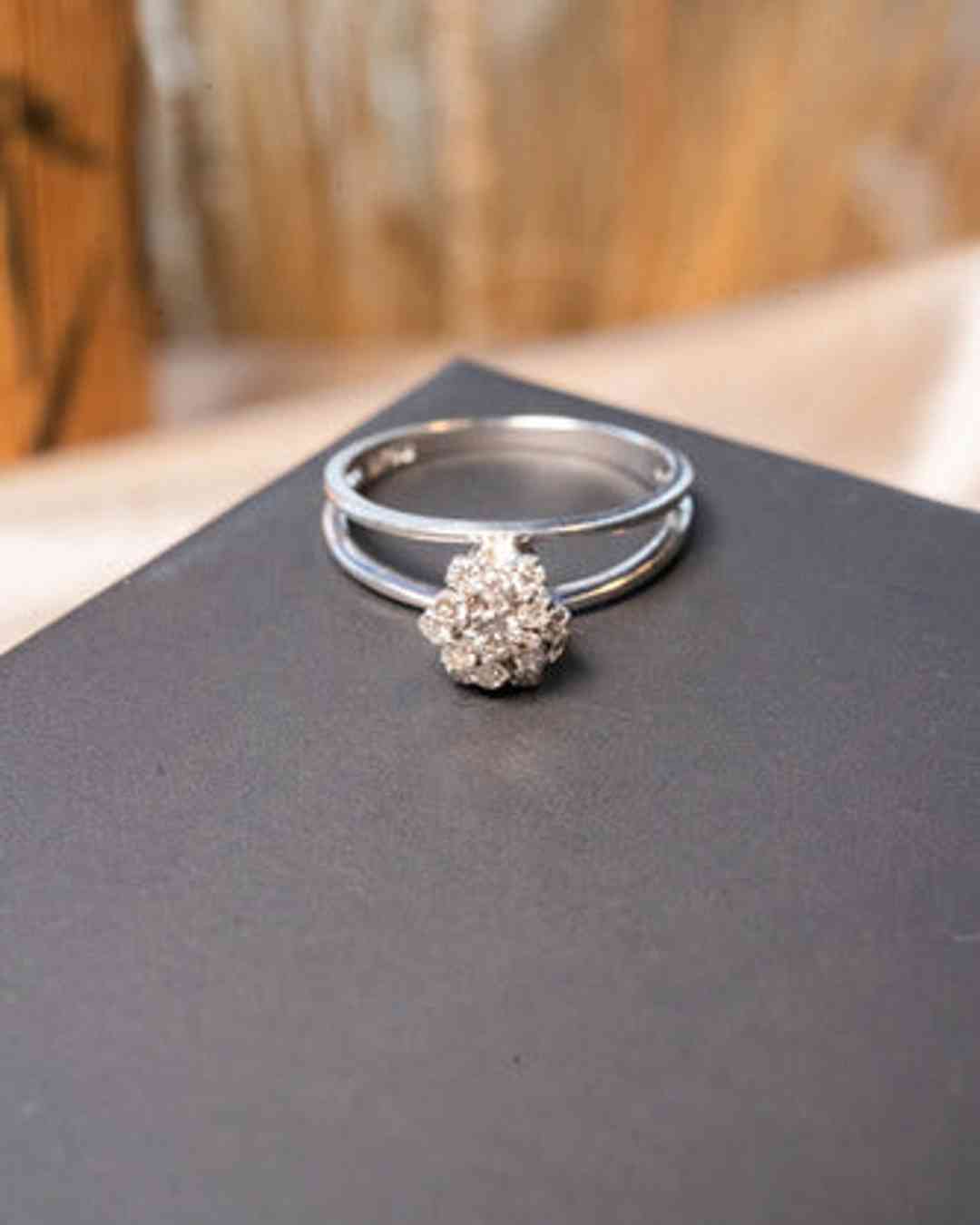 Anel Chuveirinho Bruner em ouro branco de aro tamanho 15. A joia apresenta um diamante de 6 pontos acompanhado por doze diamantes de 2 pontos, unindo modernidade e brilho refinado. peso 2,4 gramas.