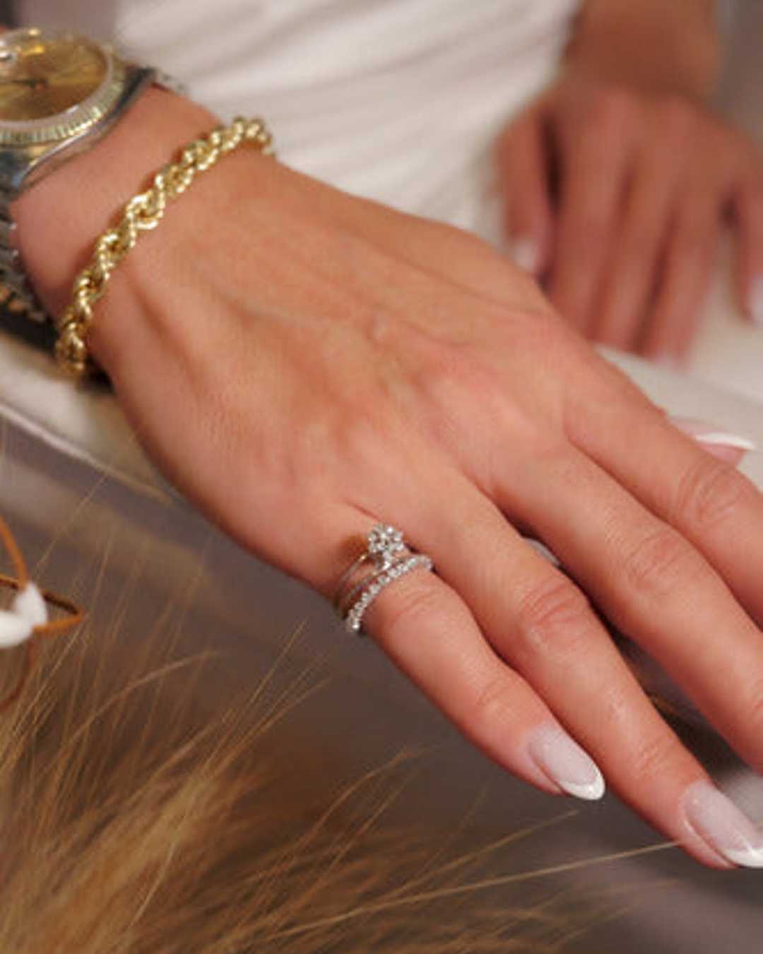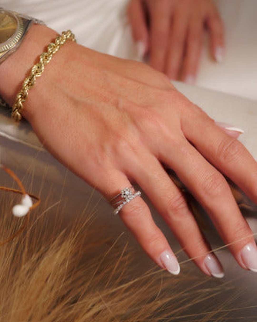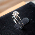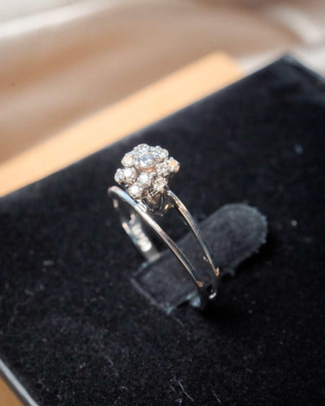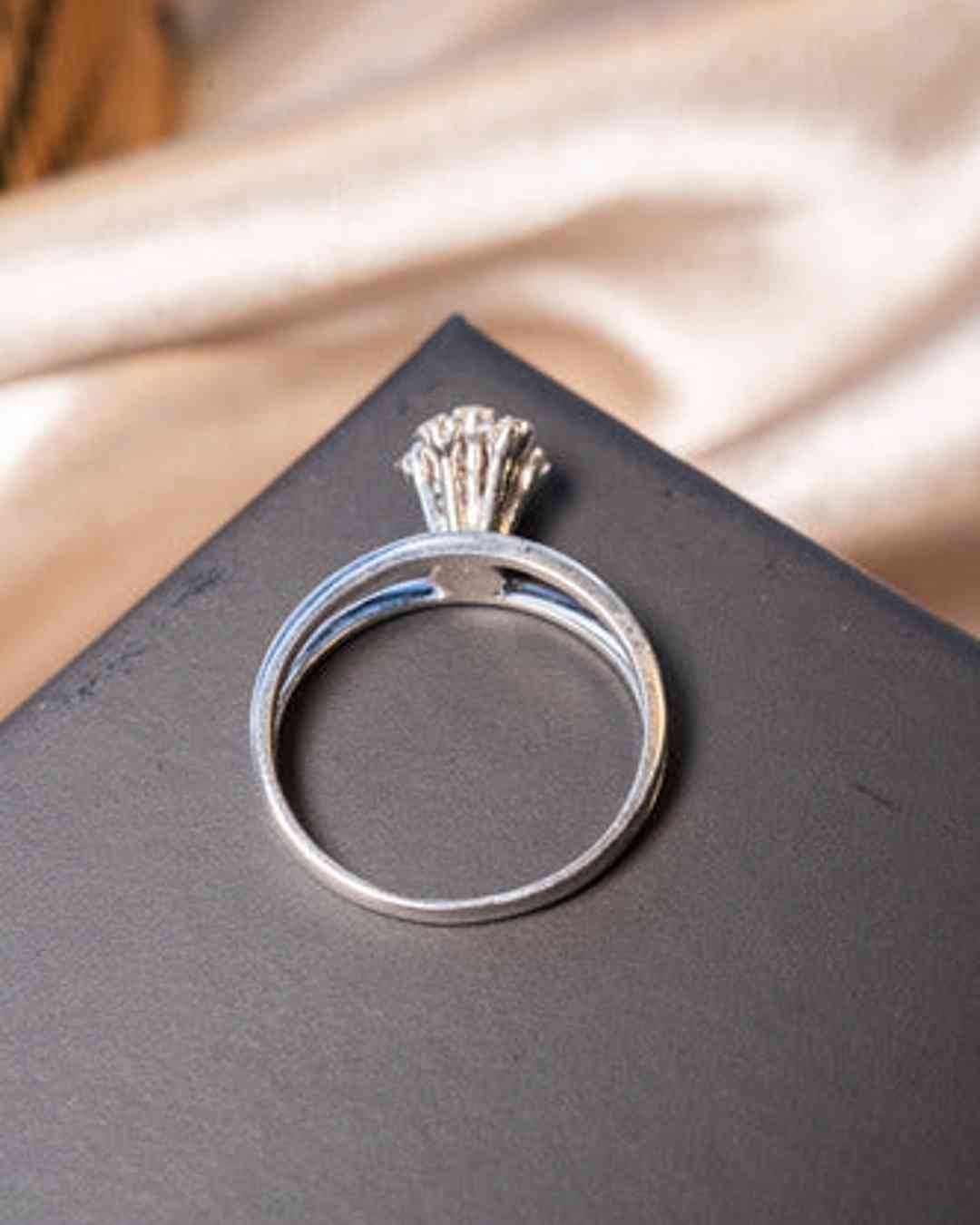Anel Chuveirinho Bruner em ouro branco de aro tamanho 15. A joia apresenta um diamante de 6 pontos acompanhado por doze diamantes de 2 pontos, unindo modernidade e brilho refinado. peso 2,4 gramas.