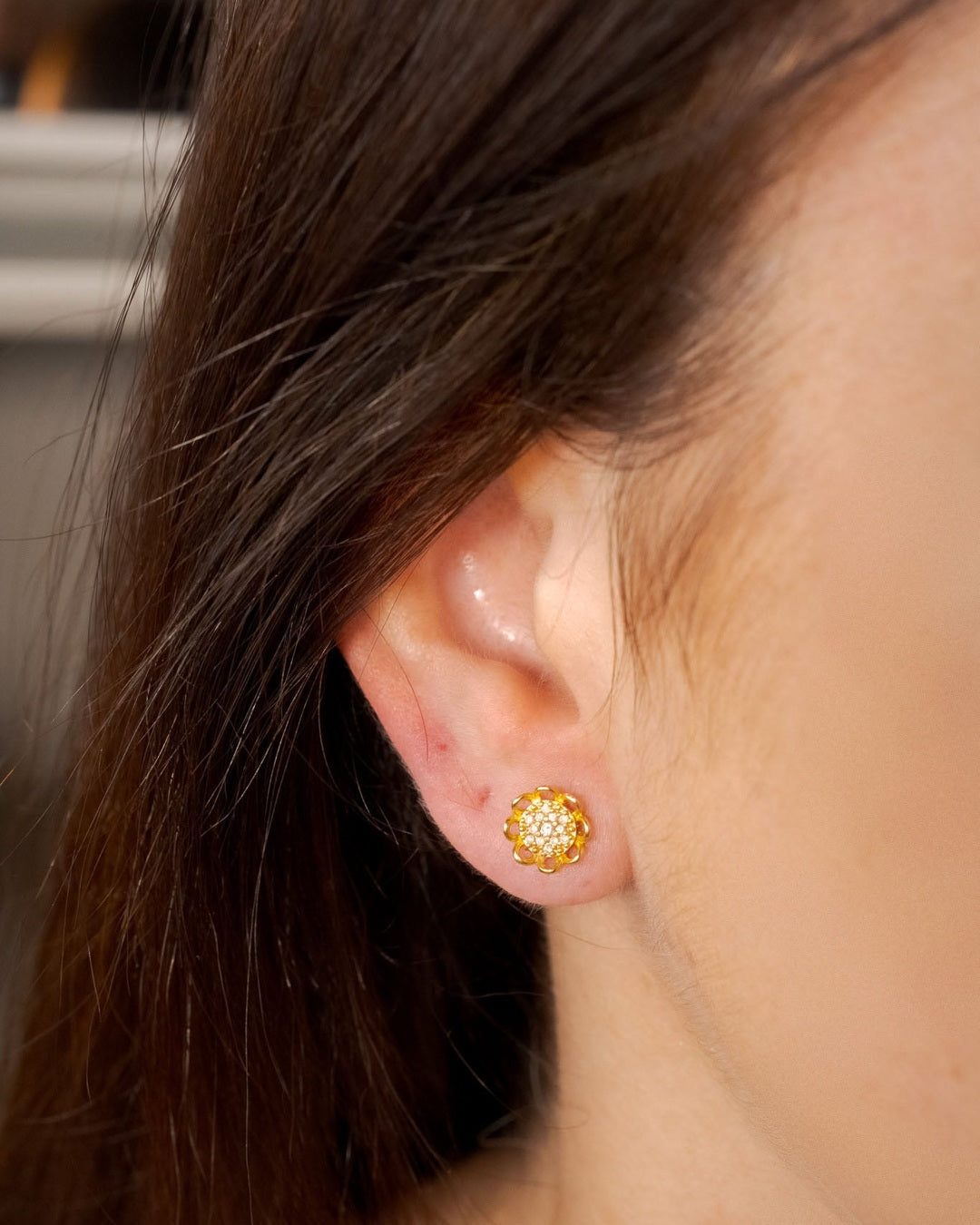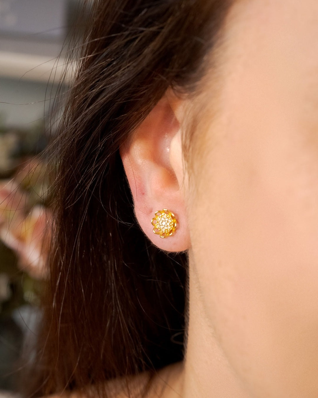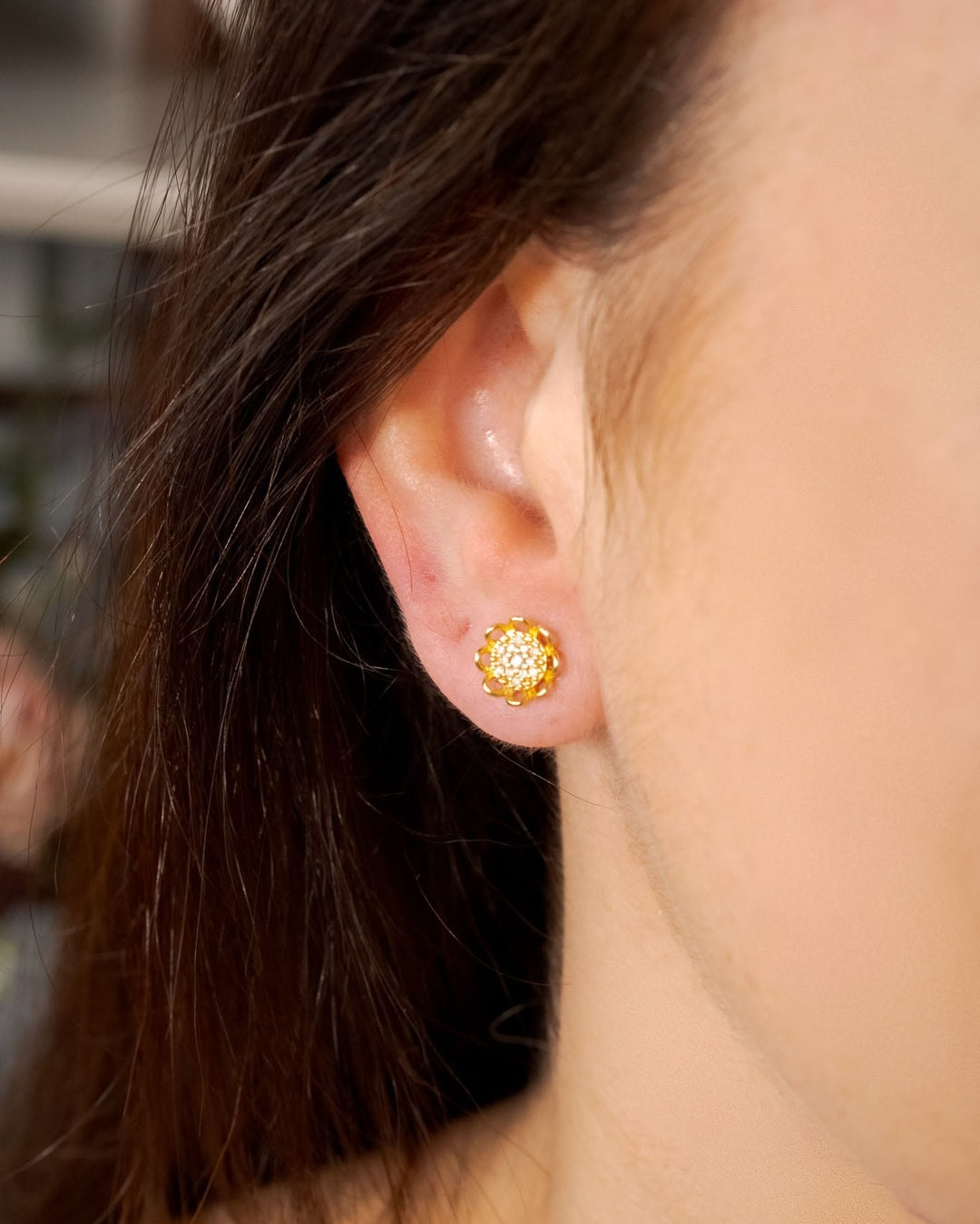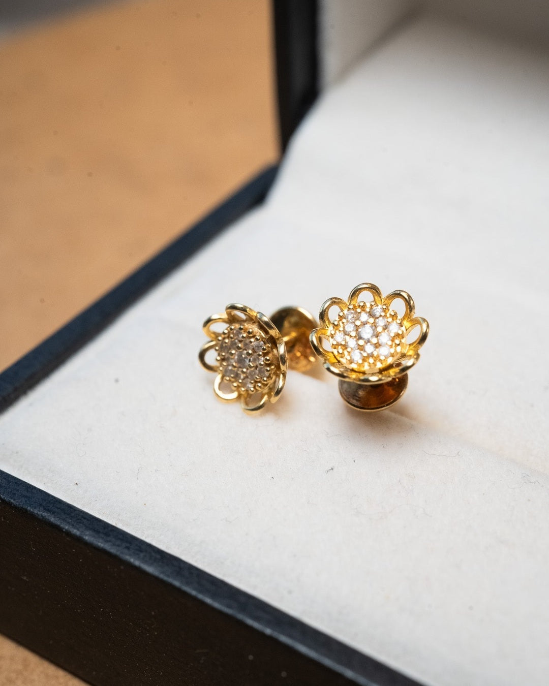 Brincos chuveirinho flower em ouro amarelo e diamantes brilhantes de 01 ponto. Peso 1.7g e 0.8cm de diâmetro.