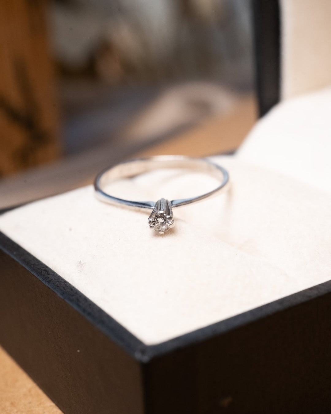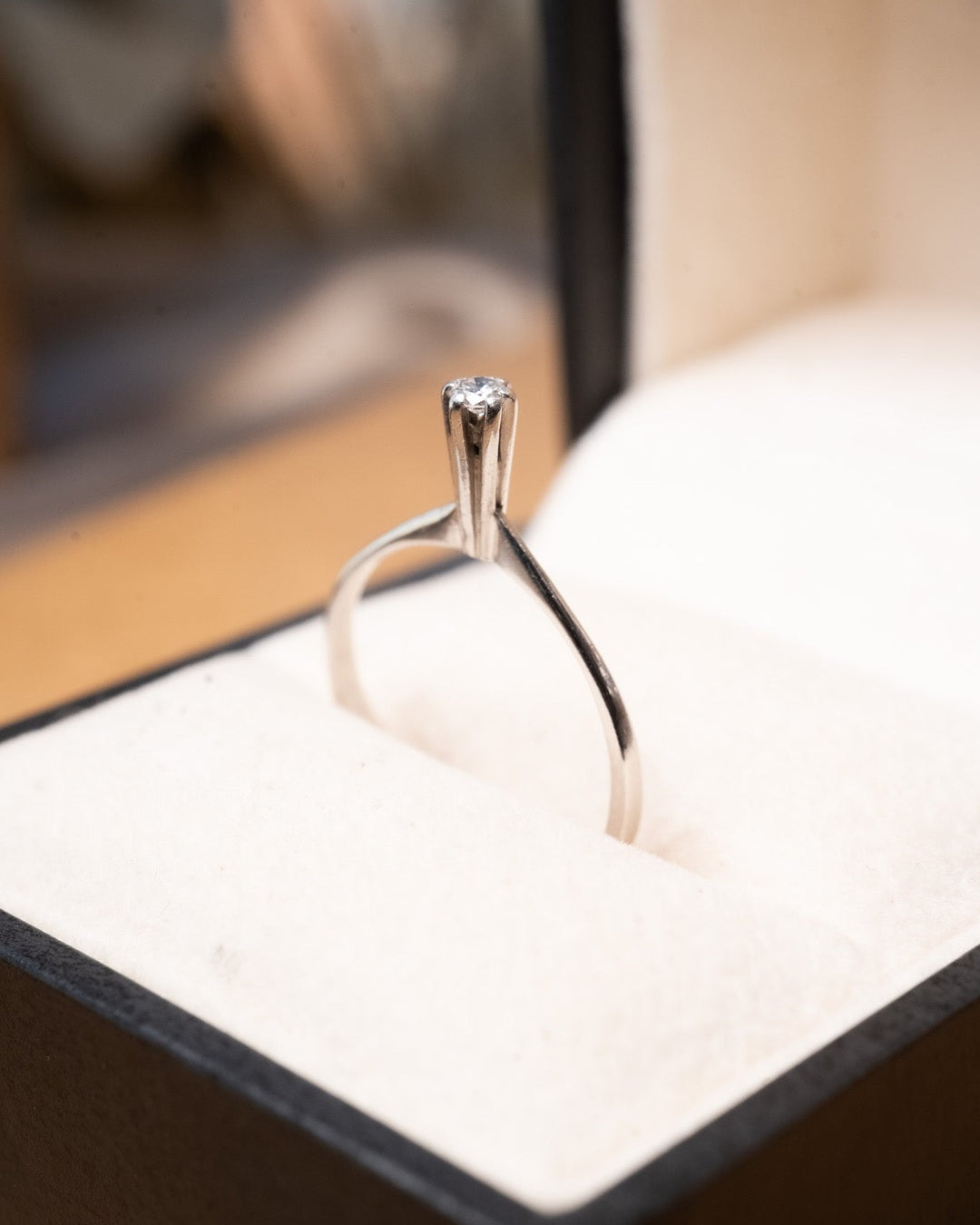 Anel solitário de ouro branco com diamante de 0.6 pontos e aro 16.5. Peso 1.3g.