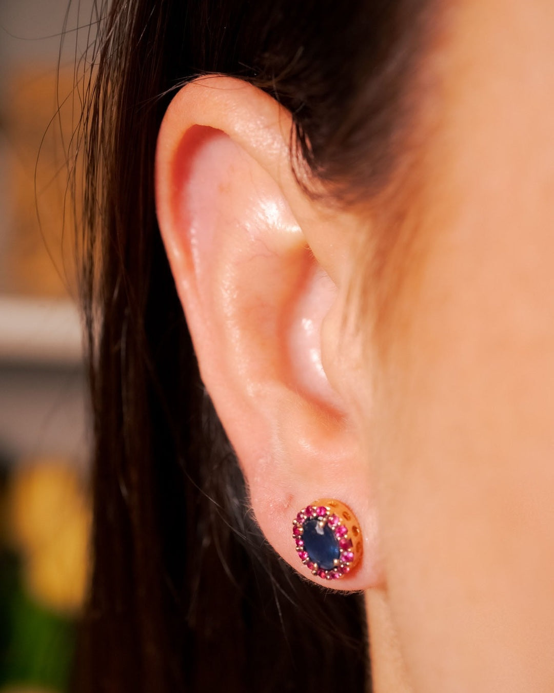Brincos Vivara Classic Oriental em ouro rosê com safiras e rubis. Medem 1.0cm x 0.8cm e pesam 2.9g.