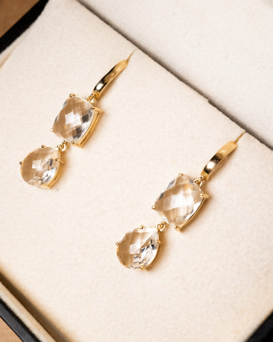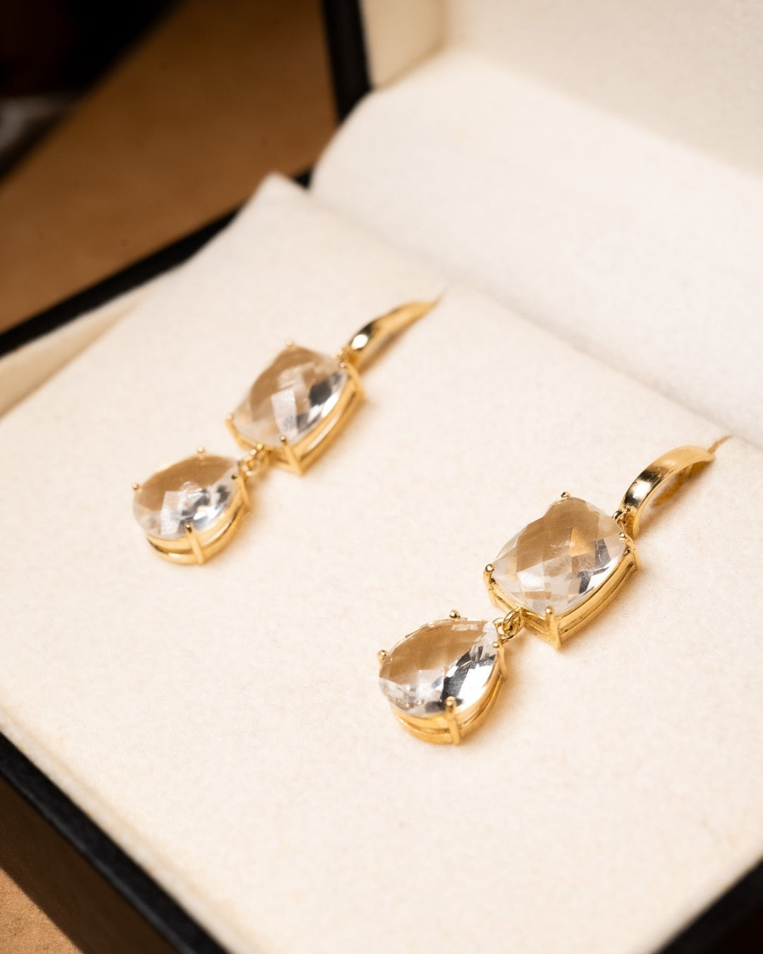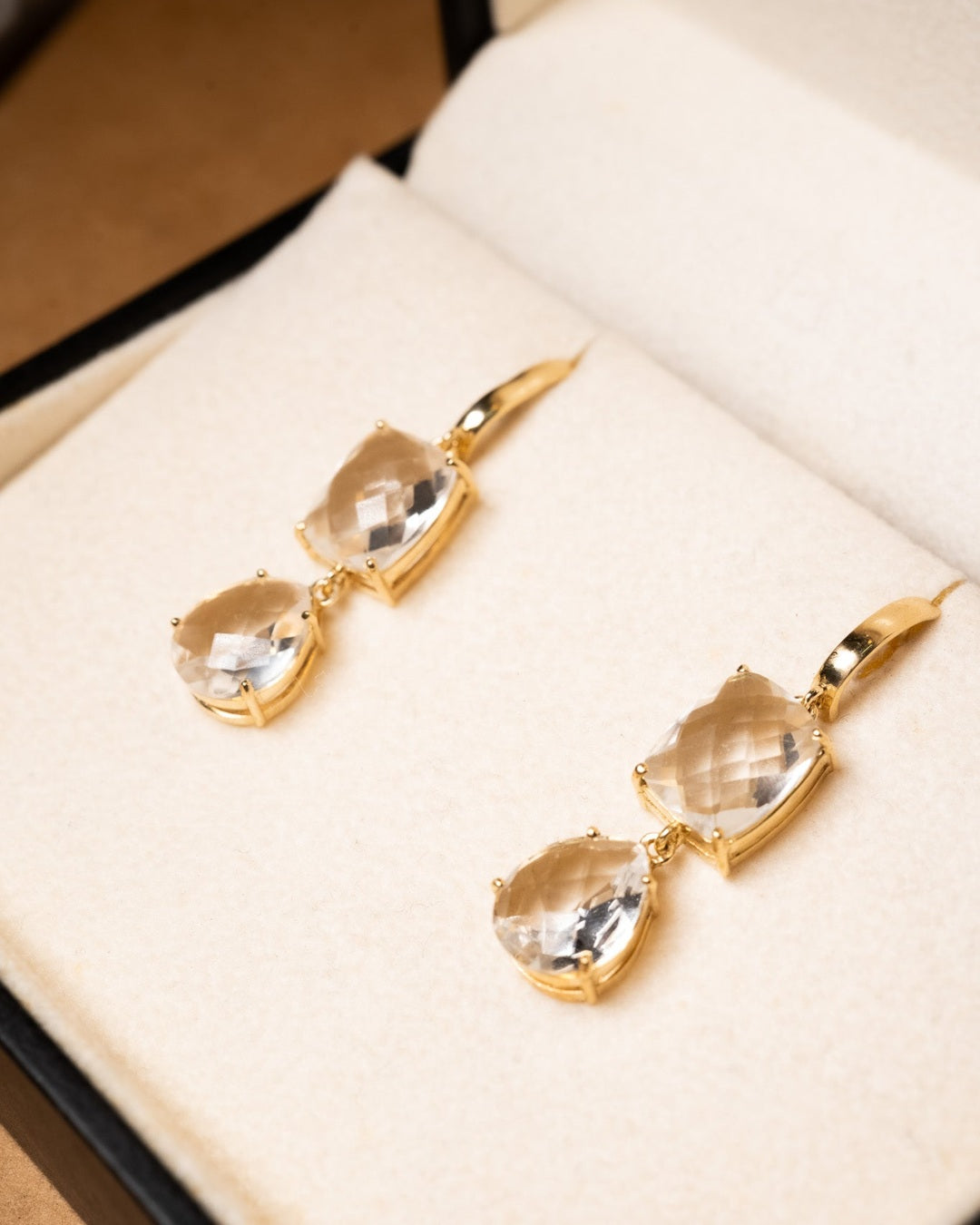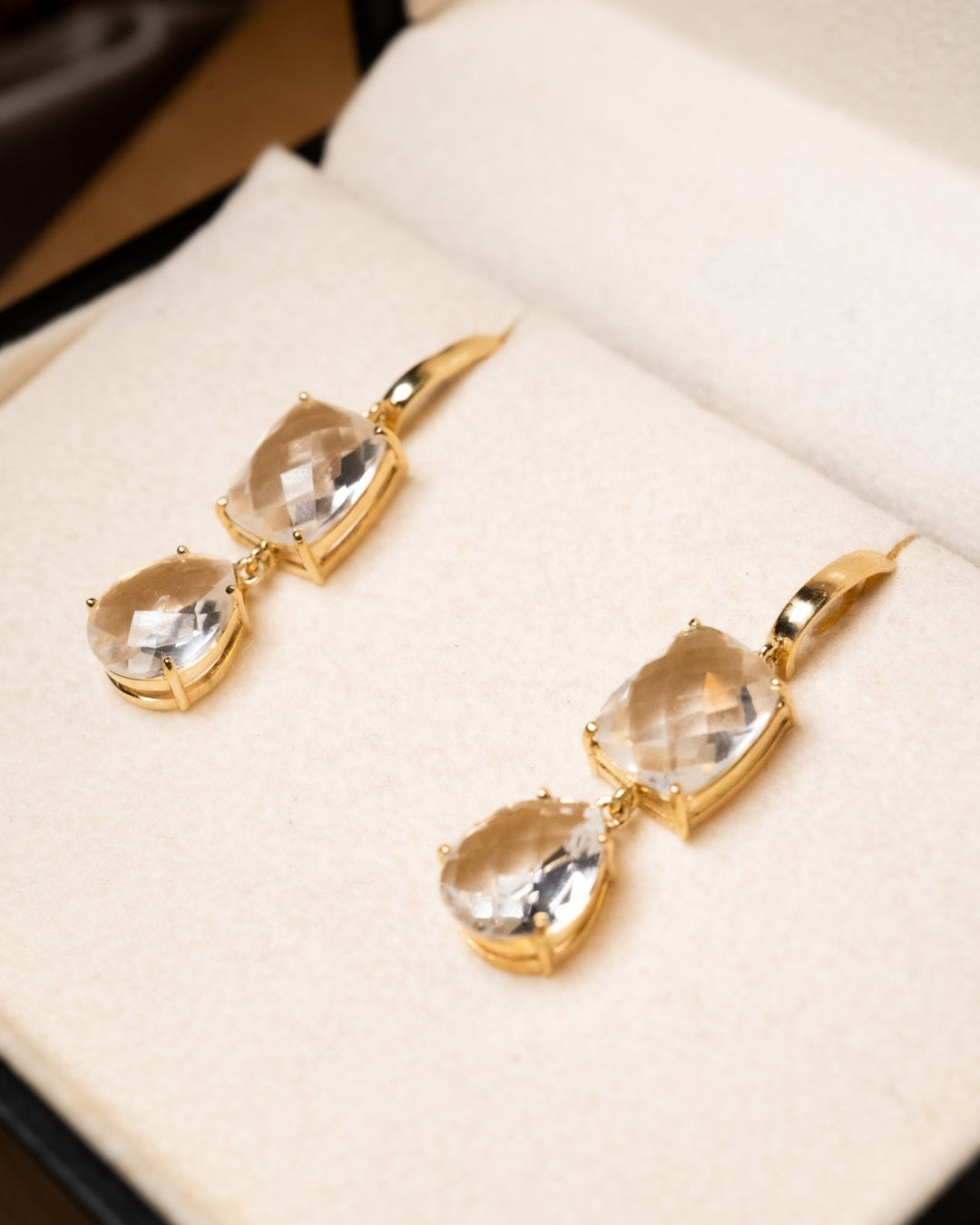 Brincos Vivara coleção Chagall de ouro amarelo com quartzos transparentes. Medem 3.6cm x 0.9cm e pesam 5.2g.