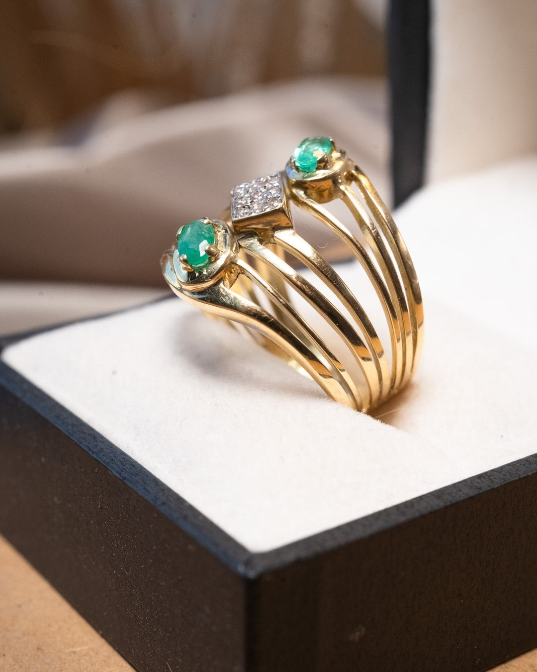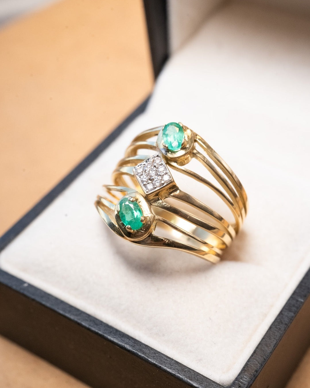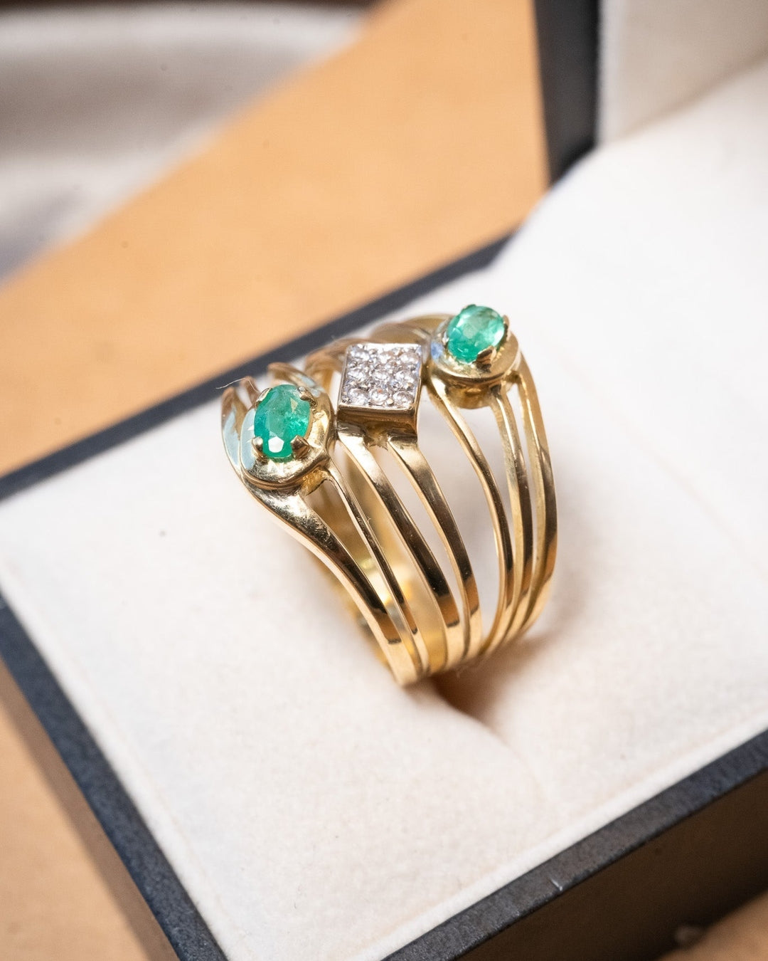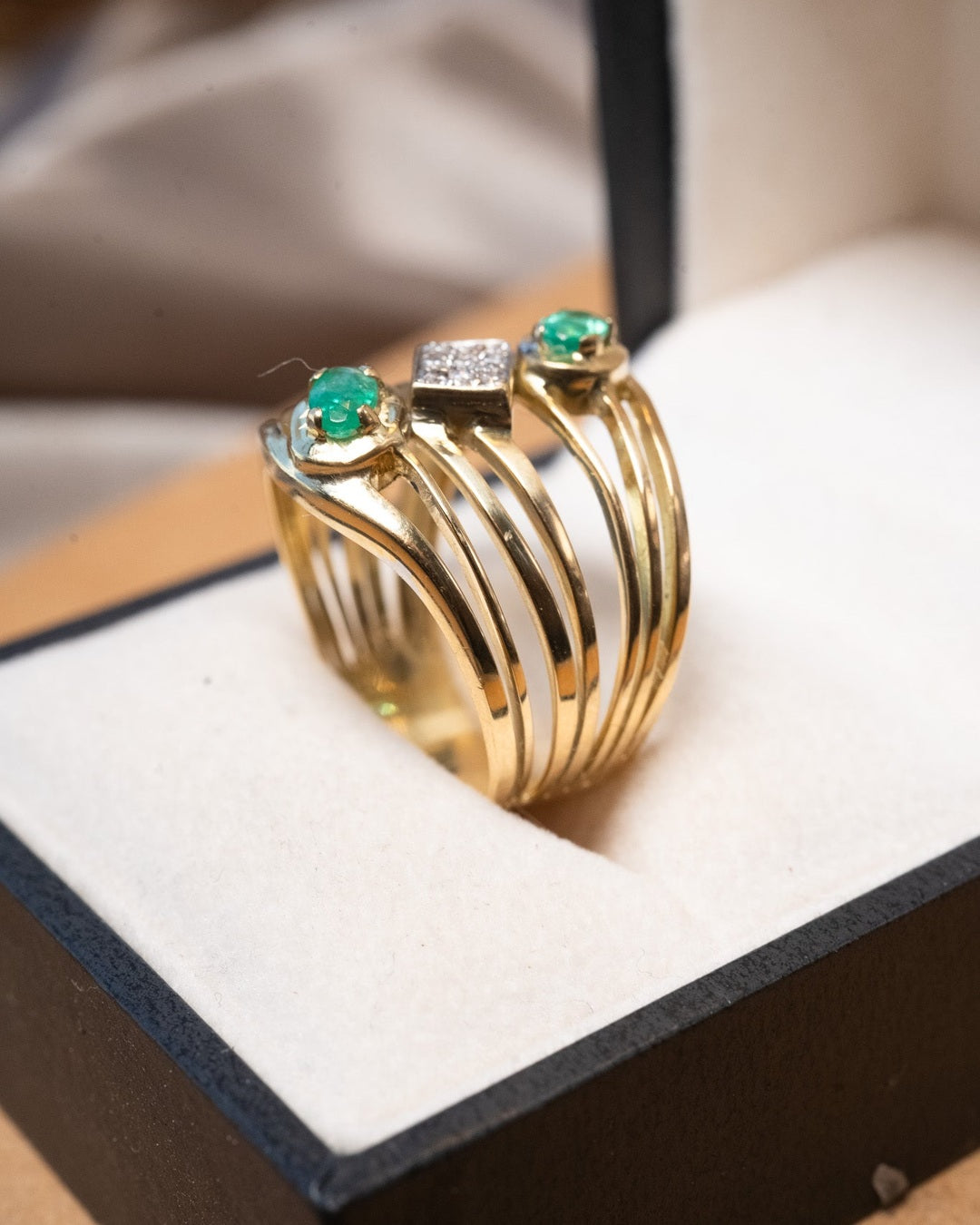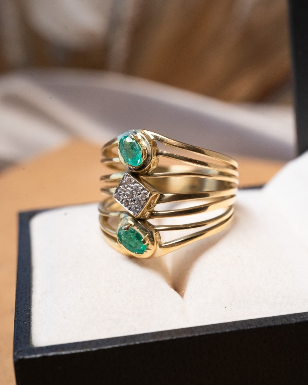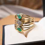 Anel bold em ouro amarelo com esmeraldas ovais de 0.3ct e safiras brancas de 0.02ct.