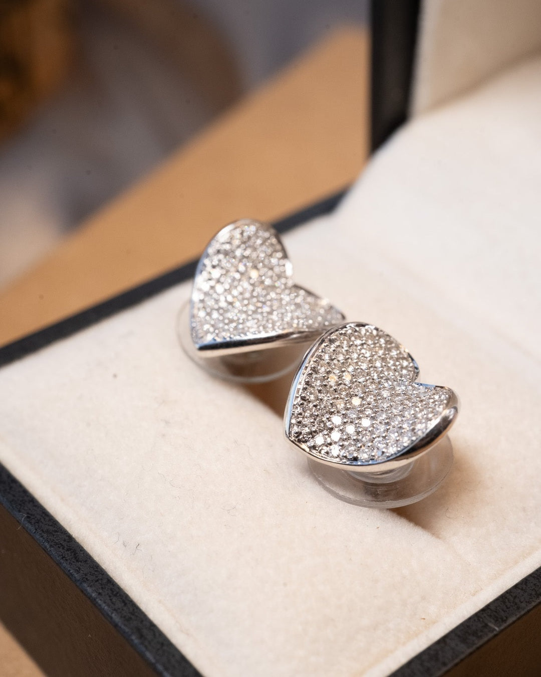 Brinco de corações em ouro branco com diamantes. Mede 1.3cm x 1.4cm e pesa 4.4g.